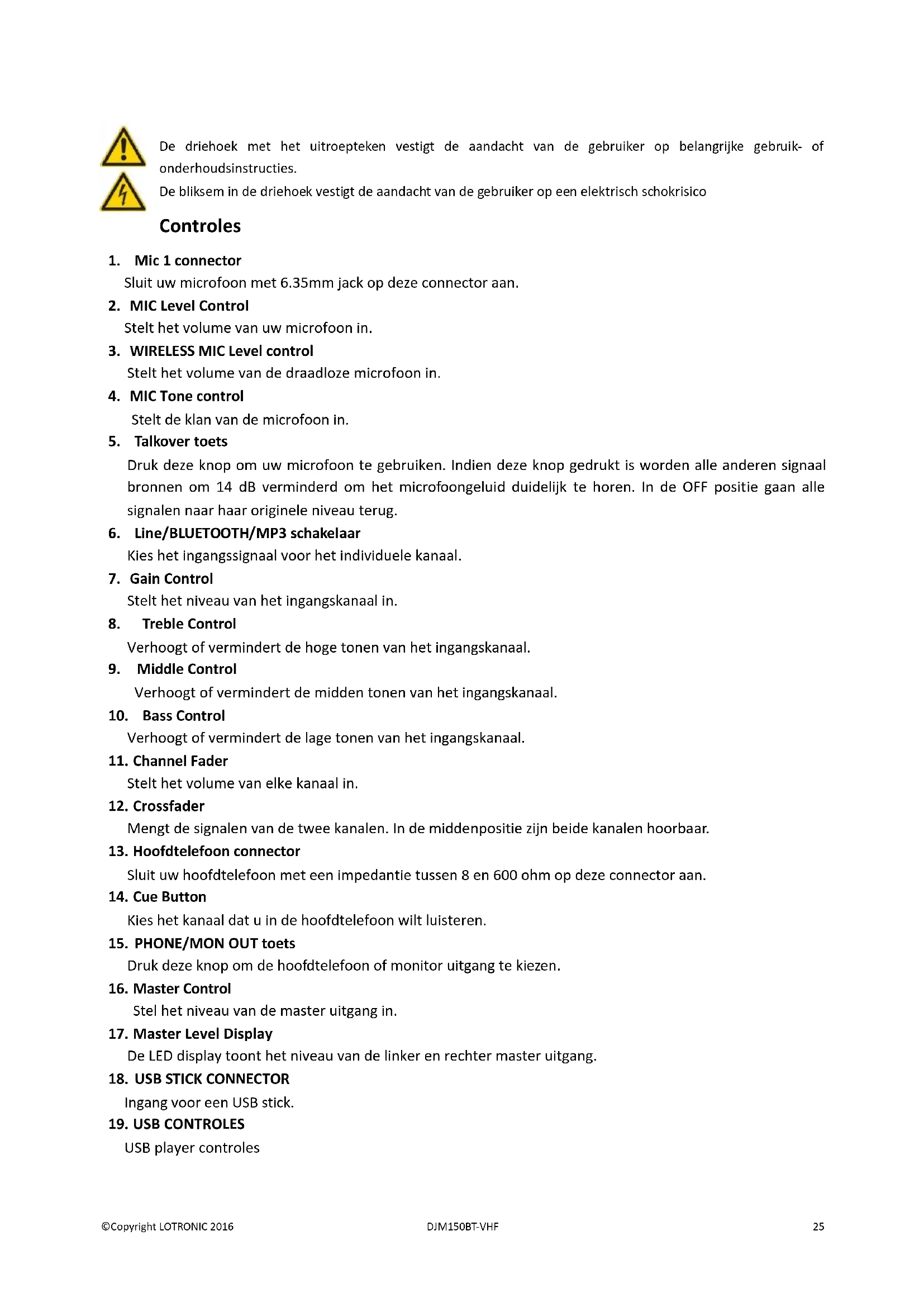 NIET OPENEN Om elektrische schokken te voorkomen, niet de boven of onderafdekking verwijderen. Het toestel bevat geen van de gebruiker vervangbare onderdelen. Laat alle reparatie van een ervarene technicus uitvoeren. Ontkoppel het toestel van het lichtnet alvorens u het achterpaneel verwijdert om toegang toe de gain schakelaar te hebben. WAARSCHUWING! Om gevaar van elektrische schokken te vermijden stel het toestel niet bloot aan regen of vochtigheid. NL©Copyright LOTRONIC 2016 DJM150BT-VHF 25 De driehoek met het uitroepteken vestigt de aandacht van de gebruiker op belangrijke gebruik- of onderhoudsinstructies. De bliksem in de driehoek vestigt de aandacht van de gebruiker op een elektrisch schokrisico Controles