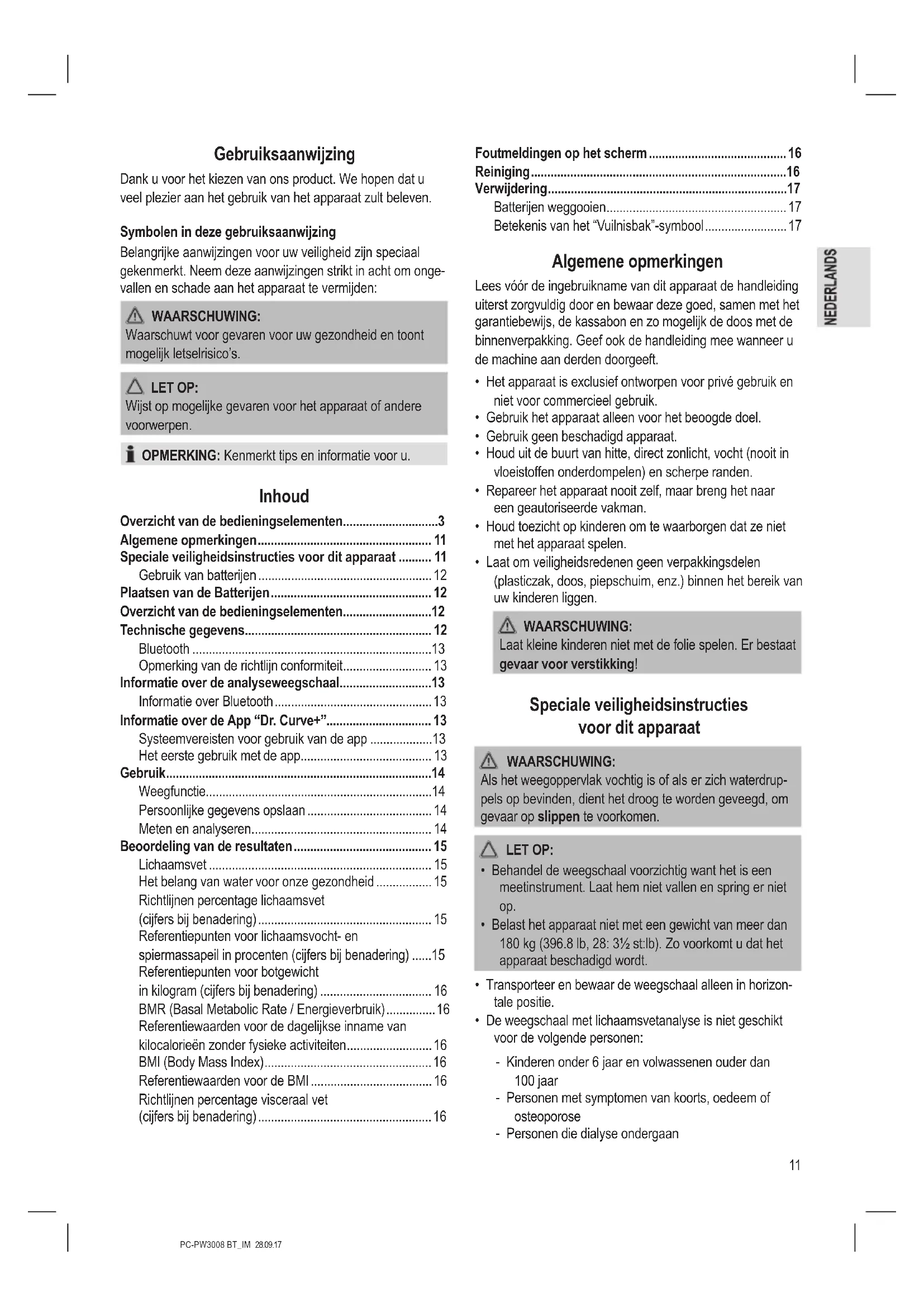 - Informationen über öffentlichen Sammelstellen erhalten Sie in Ihrer Stadt oder Gemeinde. Bedeutung des Symbols „Mülltonne“ Schonen Sie unsere Umwelt, Elektrogeräte ge- hören nicht in den Hausmüll. Nutzen Sie die für die Entsorgung von Elektroge- räten vorgesehenen Sammelstellen und geben dort Ihre Elektrogeräte ab die Sie nicht mehr benutzen werden. Sie helfen damit die potenziellen Auswirkungen, durch falsche Entsorgung, auf die Umwelt und die menschliche Gesundheit zu vermeiden. Sie leisten damit Ihren Beitrag zur Wiederverwertung, zum Recycling und zu anderen Formen der Verwertung von Elek- tro- und Elektronik-Altgeräten. Informationen, wo die Geräte zu entsorgen sind, erhalten Sie über Ihre Kommunen oder die Gemeindeverwaltungen.11 PC-PW3008 BT_IM 28.09.17 Gebruiksaanwijzing Dank u voor het kiezen van ons product. We hopen dat u veel plezier aan het gebruik van het apparaat zult beleven. Symbolen in deze gebruiksaanwijzing Belangrijke aanwijzingen voor uw veiligheid zijn speciaal gekenmerkt. Neem deze aanwijzingen strikt in acht om onge- vallen en schade aan het apparaat te vermijden: WAARSCHUWING: Waarschuwt voor gevaren voor uw gezondheid en toont mogelijk letselrisico’s. LET OP: Wijst op mogelijke gevaren voor het apparaat of andere voorwerpen. OPMERKING: Kenmerkt tips en informatie voor u. Inhoud Overzicht van de bedieningselementen ............................. 3 Algemene opmerkingen ..................................................... 11 Speciale veiligheidsinstructies voor dit apparaat .......... 11 Gebruik van batterijen ..................................................... 12 Plaatsen van de Batterijen .................................................12 Overzicht van de bedieningselementen ...........................12 Technische gegevens .........................................................12 Bluetooth .........................................................................13 Opmerking van de richtlijn conformiteit ........................... 13 Informatie over de analyseweegschaal ............................13 Informatie over Bluetooth ................................................ 13 Informatie over de App “Dr. Curve+” ................................ 13 Systeemvereisten voor gebruik van de app ...................13 Het eerste gebruik met de app ........................................13 Gebruik .................................................................................14 Weegfunctie.....................................................................14 Persoonlijke gegevens opslaan ...................................... 14 Meten en analyseren .......................................................14 Beoordeling van de resultaten ..........................................15 Lichaamsvet .................................................................... 15 Het belang van water voor onze gezondheid ................. 15 Richtlijnen percentage lichaamsvet (cijfers bij benadering) .....................................................15 Referentiepunten voor lichaamsvocht- en spiermassapeil in procenten (cijfers bij benadering) ......15 Referentiepunten voor botgewicht in kilogram (cijfers bij benadering) .................................. 16 BMR (Basal Metabolic Rate / Energieverbruik) ............... 16 Referentiewaarden voor de dagelijkse inname van kilocalorieën zonder fysieke activiteiten ..........................16 BMI (Body Mass Index) ...................................................16 Referentiewaarden voor de BMI ..................................... 16 Richtlijnen percentage visceraal vet (cijfers bij benadering) .....................................................16 Foutmeldingen op het scherm .......................................... 16 Reiniging ..............................................................................16 Verwijdering .........................................................................17 Batterijen weggooien .......................................................17 Betekenis van het “Vuilnisbak”-symbool .........................17 Algemene opmerkingen Lees vóór de ingebruikname van dit apparaat de handleiding uiterst zorgvuldig door en bewaar deze goed, samen met het garantiebewijs, de kassabon en zo mogelijk de doos met de binnenverpakking. Geef ook de handleiding mee wanneer u de machine aan derden doorgeeft.