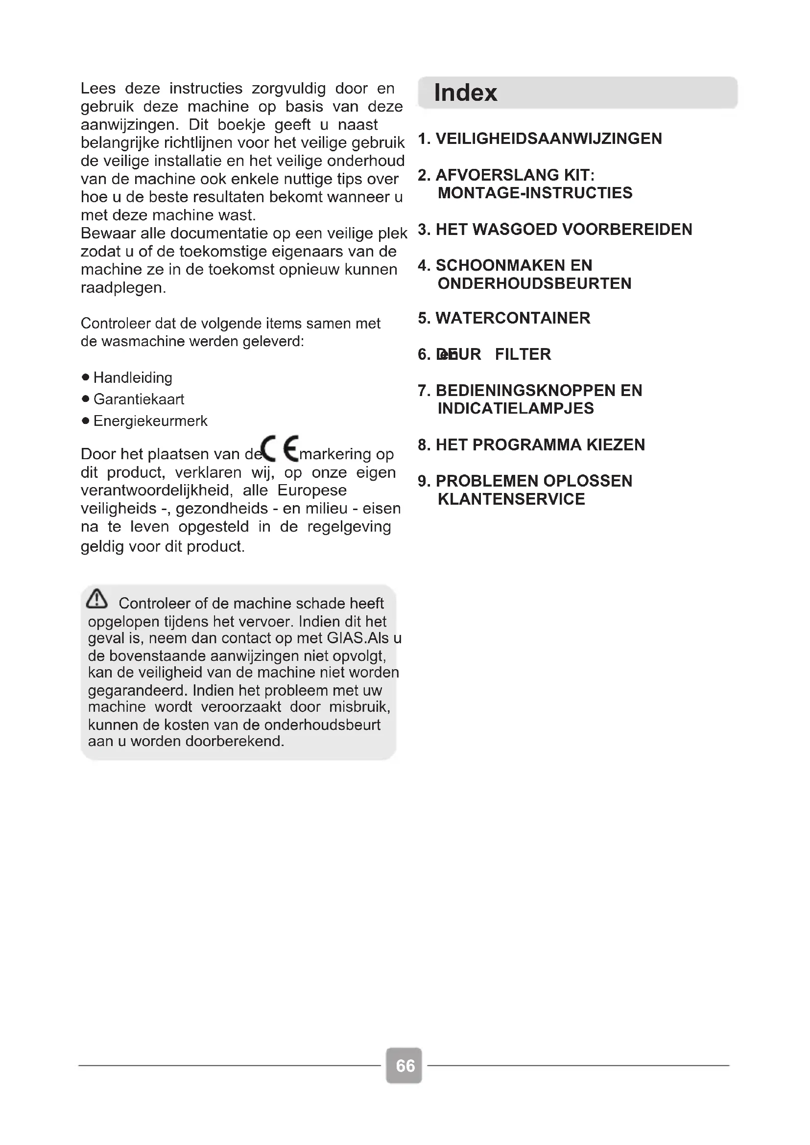 Index Lees deze instructies zorgvuldig door en gebruik deze machine op basis van deze aanwijzingen. Dit boekje geeft u naast belangrijke richtlijnen voor het veilige gebruik de veilige installatie en het veilige onderhoud van de machine ook enkele nuttige tips over hoe u de beste resultaten bekomt wanneer u met deze machine wast. Bewaar alle documentatie op een veilige plek zodat u of de toekomstige eigenaars van de machine ze in de toekomst opnieuw kunnen raadplegen Controleer dat de volgende items samen met de wasmachine werden geleverd:HandleidingGarantiekaartEnergiekeurmerk
