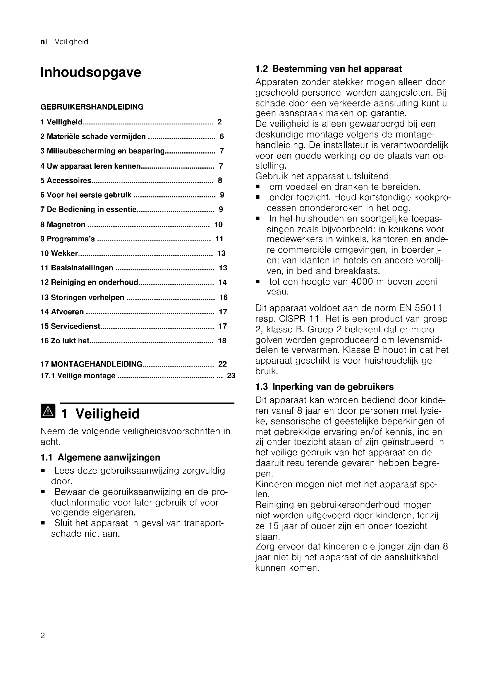 1 Veiligheid Neem de volgende veiligheidsvoorschriften in acht. 1.1 Algemene aanwijzingen ¡ Lees deze gebruiksaanwijzing zorgvuldig door. ¡ Bewaar de gebruiksaanwijzing en de pro- ductinformatie voor later gebruik of voor volgende eigenaren. ¡ Sluit het apparaat in geval van transport- schade niet aan. 1.2 Bestemming van het apparaat Apparaten zonder stekker mogen alleen door geschoold personeel worden aangesloten. Bij schade door een verkeerde aansluiting kunt u geen aanspraak maken op garantie. De veiligheid is alleen gewaarborgd bij een deskundige montage volgens de montage- handleiding. De installateur is verantwoordelijk voor een goede werking op de plaats van op- stelling. Gebruik het apparaat uitsluitend: ¡ om voedsel en dranken te bereiden. ¡ onder toezicht. Houd kortstondige kookpro- cessen ononderbroken in het oog. ¡ In het huishouden en soortgelijke toepas- singen zoals bijvoorbeeld: in keukens voor medewerkers in winkels, kantoren en ande- re commerciële omgevingen, in boerderij- en; van klanten in hotels en andere verblij- ven, in bed and breakfasts. ¡ tot een hoogte van 4000m boven zeeni- veau. Dit apparaat voldoet aan de norm EN55011 resp. CISPR11. Het is een product van groep 2, klasse B. Groep 2 betekent dat er micro- golven worden geproduceerd om levensmid- delen te verwarmen. Klasse B houdt in dat het apparaat geschikt is voor huishoudelijk ge- bruik. 1.3 Inperking van de gebruikers Dit apparaat kan worden bediend door kinde- ren vanaf 8 jaar en door personen met fysie- ke, sensorische of geestelijke beperkingen of met gebrekkige ervaring en/of kennis, indien zij onder toezicht staan of zijn geïnstrueerd in het veilige gebruik van het apparaat en de daaruit resulterende gevaren hebben begre- pen. Kinderen mogen niet met het apparaat spe- len. Reiniging en gebruikersonderhoud mogen niet worden uitgevoerd door kinderen, tenzij ze 15jaar of ouder zijn en onder toezicht staan. Zorg ervoor dat kinderen die jonger zijn dan 8 jaar niet bij het apparaat of de aansluitkabel kunnen komen.Veiligheid nl