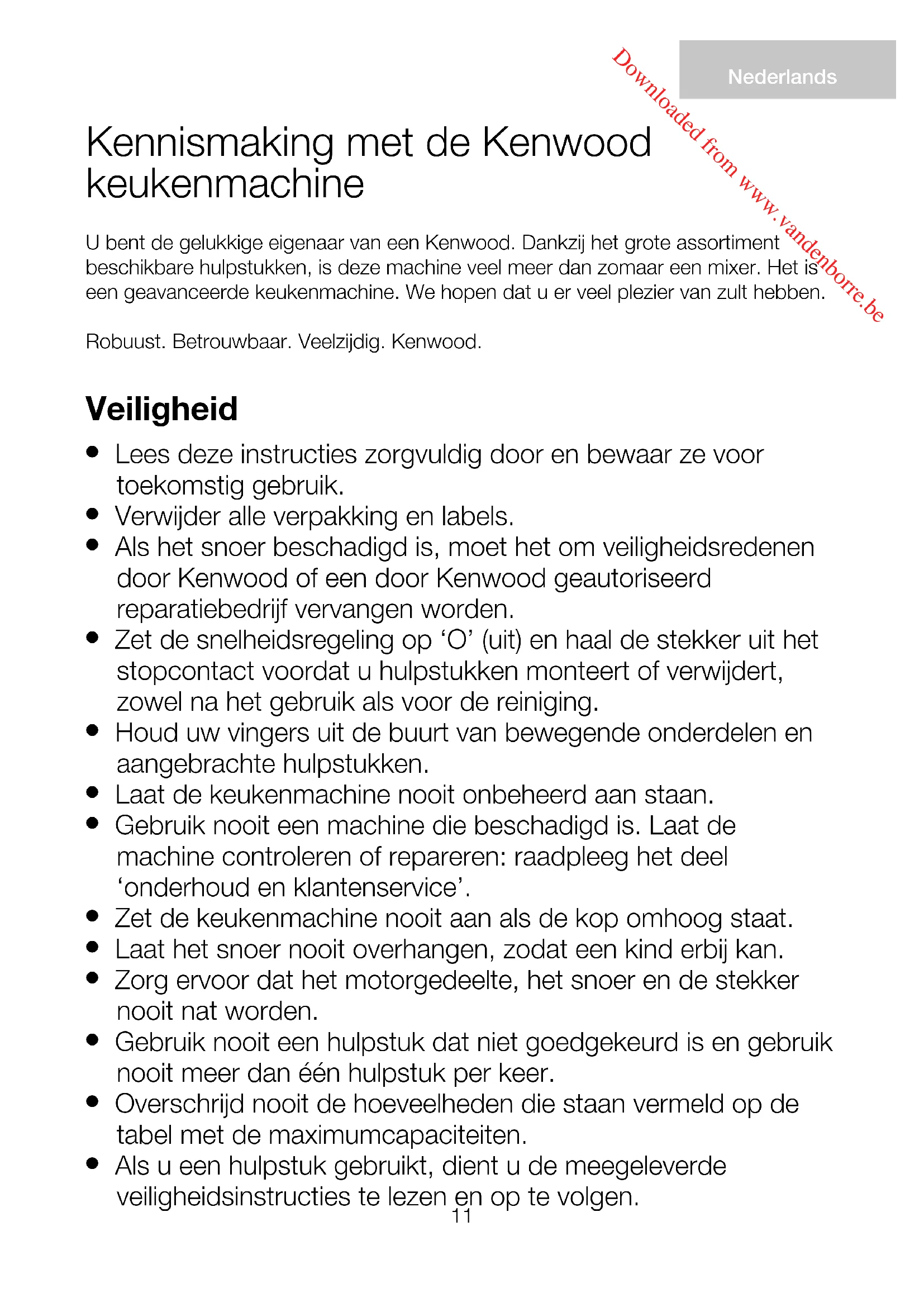 ELEKTRONISCHE APPARATUUR (AEEA) Aan het einde van de levensduur van het product mag het niet samen met het gewone huishoudelijke afval worden verwerkt. Het moet naar een speciaal centrum voor gescheiden afvalinzameling van de gemeente worden gebracht, of naar een verkooppunt dat deze service verschaft. Het apart verwerken van een huishoudelijk apparaat voorkomt mogelijke gevolgen voor het milieu en de gezondheid die door een ongeschikte verwerking ontstaan en zorgt ervoor dat de materialen waaruit het apparaat bestaat, teruggewonnen kunnen worden om een aanmerkelijke besparing van energie en grondstoffen te verkrijgen. Om op de verplichting tot gescheiden verwerking van elektrische huishoudelijke apparatuur te wijzen, is op het product het symbool van een doorgekruiste vuilnisbak aangebracht. Downloaded from www.vandenborre.beDécouvrez votre robot pâtissier multifonction Kenwood Nous tenons à vous féliciter d’avoir porté votre choix sur un robot Kenwood. Avec un tel éventail d’accessoires, votre robot de cuisine est bien plus qu’un simple robot pâtissier. Vous bénéficiez du robot pâtissier multifonction le plus perfectionné à ce jour. Nous espérons qu’il vous apportera pleine satisfaction. Robuste. Fiable. Polyvalent. Kenwood.