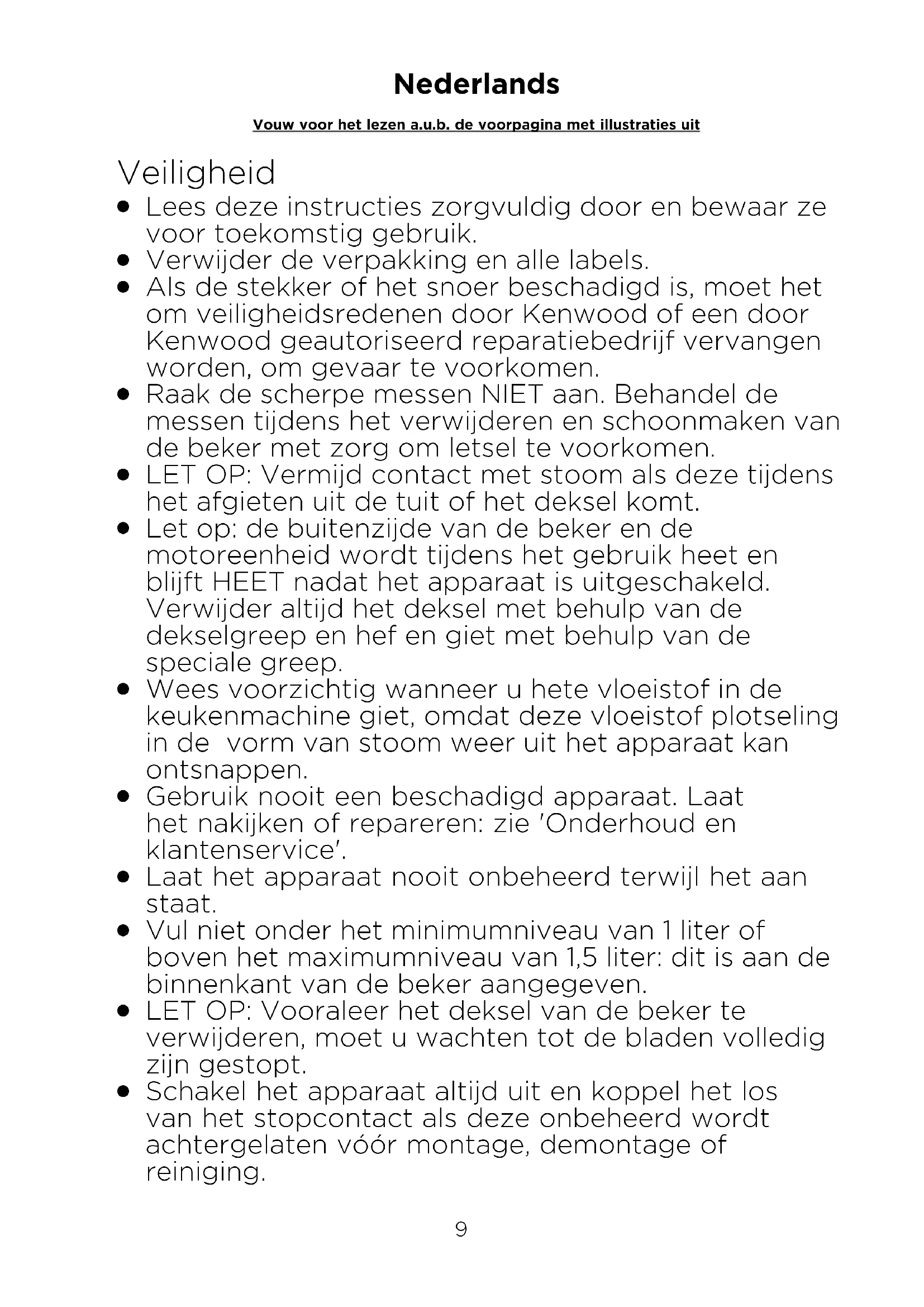 Vervaardigd in China. 14Problemen oplossen Probleem Oorzaak Oplossing Soepmaker werkt niet. Geen stroom en geen lichten aan. De stroomvoorziening zit niet goed vast. Controleer of de Soepmaker is aangesloten op de Stroomvoorziening. Controleer of de beker goed is aangesloten. Controleer of de bovenliggende motoreenheid/het deksel gemonteerd Deksel of stroomeenheid past niet Beker te vol Verwijder enkele van de ingrediënten en ervoor zorgen dat de ingrediënten gelijkmatig worden verdeeld zodat het deksel past. Teveel trillingen Het apparaat is niet stabiel Teveel ingredienten worden verwerkt. Dit apparaat mag alleen worden gebruikt op een stabiel, vlak hittebestendig oppervlak of tafel. Verwijder een aantal van de ingrediënten. ---- op het scherm Apparaat in standby mode. Trek de stekker uit het stopcontact als het kookproces klaar of druk op een knop om de Soepmaker reactiveren. Spetteren uit de tuit Beker te vol Easy Clean programma – Meer dan 1 liter water en teveel afwasmiddel. Controleer of de ingrediënten niet zijn gevuld boven het maximale niveau dat in de beker is aangegeven. Voeg 1 liter water en 2 druppels afwasmiddel. Aan de onderkant van de pan branden ingredienten aan. Melk wordt opgewarmd. NIet genoeg vloeistof Het apparaat is niet ontworpen om melk te verwarmen. Gebruik de 'Pauze' functie en melk, room enz. toevoegen binnen de laatste 5-10 minuten van het programma. Voeg meer vloeistof toe. BELANGRIJKE INFORMATIE VOOR DE JUISTE VERWIJDERING VAN HET PRODUCT VOLGENS DE EUROPESE RICHTLIJN BETREFFENDE AFGEDANKTE ELEKTRISCHE EN ELEKTRONISCHE APPARATUUR (AEEA) Aan het einde van de levensduur van het product mag het niet samen met het gewone huishoudelijke afval worden verwijderd. Het moet naar een speciaal centrum voor gescheiden afvalinzameling van de gemeente worden gebracht, of naar een verkooppunt dat deze service verschaft. 15Probleem Oorzaak Oplossing Geen goede mengprestatie. Onvoldoende verwerkingstijd. Onvoldoende vloeistof toegevoegd. Grote stukken voedsel of te veel ingrediënten. Start het programma opnieuw op en meng langer. Voeg meer vloeistof toe. Verwijder enkele van de grote stukken voedsel. Voedsel ongekookt Grote stukken voedsel of te veel ingrediënten wordt verwerkt. Rouw vlees wordt gekookt. Verwijder enkele van de ingrediënten en maak alle stukken van dezelfde grootte. Het is aan te bevelen dat het vlees gebruind wordt in een pan op het fornuis voordat het wordt toegevoegd. Rouw vlees moet goed gekookt worden. Error code E0 Sensor kapot Neem contact op met uw dichtstbijzijnde geautoriseerde Kenwood Service Center of bezoek www.kenwoodworld.com Error code EF Beker gevuld boven MAX markering en overvulsensor geactiveerd. Trek de stekker uit het stopcontact, verwijder de motoreenheid en laat afkoelen voor 3 minuten. Verwijder een deel van de ingrediënten en zorg ervoor dat deze niet gevuld zijn boven het MAX-niveau. Monteer de motor eenheid, sluit het apparaat aan en werk als normaal. Als het probleem blijft bestaan, neem dan contact op met het dichtstbijzijnde geautoriseerde Kenwood-servicecentrum. Voor actuele informatie over het dichtstbijzijnde Kenwood-servicecentrum kunt u terecht op www.kenwoodworld.com of op de website die specifiek is voor uw land. 16Français Veuillez déplier les illustrations de la première page Sécurité