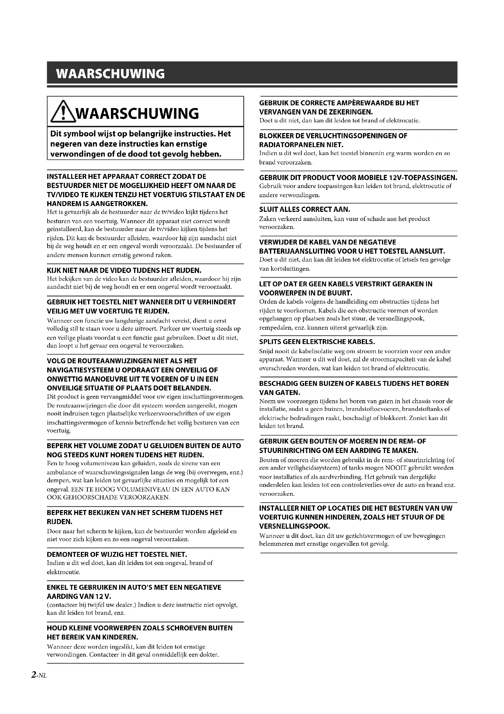 - Technische gegevens ALPINE X902D/X802D-U/INE-W710D/i902D/iLX-702D 68-34732Z07-A (NL) 2-NL WAARSCHUWING WAARSCHUWING Dit symbool wijst op belangrijke instructies. Het negeren van deze instructies kan ernstige verwondingen of de dood tot gevolg hebben. INSTALLEER HET APPARAAT CORRECT ZODAT DE BESTUURDER NIET DE MOGELIJKHEID HEEFT OM NAAR DE TV/VIDEO TE KIJKEN TENZIJ HET VOERTUIG STILSTAAT EN DE HANDREM IS AANGETROKKEN.Het is gevaarlijk als de bestuurder naar de tv/video kijkt tijdens het besturen van een voertuig. Wanneer dit apparaat niet correct wordt geïnstalleerd, kan de bestuurder naar de tv/video kijken tijdens het rijden. Dit kan de bestuurder afleiden, waardoor hij zijn aandacht niet bij de weg houdt en er een ongeval wordt veroorzaakt. De bestuurder of andere mensen kunnen ernstig gewond raken.KIJK NIET NAAR DE VIDEO TIJDENS HET RIJDEN.Het bekijken van de video kan de bestuurder afleiden, waardoor hij zijn aandacht niet bij de weg houdt en er een ongeval wordt veroorzaakt.GEBRUIK HET TOESTEL NIET WANNEER DIT U VERHINDERT VEILIG MET UW VOERTUIG TE RIJDEN.Wanneer een functie uw langdurige aandacht vereist, dient u eerst volledig stil te staan voor u deze uitvoert. Parkeer uw voertuig steeds op een veilige plaats voordat u een functie gaat gebruiken. Doet u dit niet, dan loopt u het gevaar een ongeval te veroorzaken.VOLG DE ROUTEAANWIJZINGEN NIET ALS HET NAVIGATIESYSTEEM U OPDRAAGT EEN ONVEILIG OF ONWETTIG MANOEUVRE UIT TE VOEREN OF U IN EEN ONVEILIGE SITUATIE OF PLAATS DOET BELANDEN.Dit product is geen vervangmiddel voor uw eigen inschattingsvermogen. De routeaanwijzingen die door dit systeem worden aangereikt, mogen nooit indruisen tegen plaatselijke verkeersvoorschriften of uw eigen inschattingsvermogen of kennis betreffende het veilig besturen van een voertuig.BEPERK HET VOLUME ZODAT U GELUIDEN BUITEN DE AUTO NOG STEEDS KUNT HOREN TIJDENS HET RIJDEN.Een te hoog volumeniveau kan geluiden, zoals de sirene van een ambulance of waarschuwingssignalen langs de weg (bij overwegen, enz.) dempen, wat kan leiden tot gevaarlijke situaties en mogelijk tot een ongeval. EEN TE HOOG VOLUMENIVEAU IN EEN AUTO KAN OOK GEHOORSCHADE VEROORZAKEN.BEPERK HET BEKIJKEN VAN HET SCHERM TIJDENS HET RIJDEN.Door naar het scherm te kijken, kan de bestuurder worden afgeleid en niet voor zich kijken en zo een ongeval veroorzaken.DEMONTEER OF WIJZIG HET TOESTEL NIET.Indien u dit wel doet, kan dit leiden tot een ongeval, brand of elektrocutie.ENKEL TE GEBRUIKEN IN AUTO’S MET EEN NEGATIEVE AARDING VAN 12 V.(contacteer bij twijfel uw dealer.) Indien u deze instructie niet opvolgt, kan dit leiden tot brand, enz.HOUD KLEINE VOORWERPEN ZOALS SCHROEVEN BUITEN HET BEREIK VAN KINDEREN.Wanneer deze worden ingeslikt, kan dit leiden tot ernstige verwondingen. Contacteer in dit geval onmiddellijk een dokter.GEBRUIK DE CORRECTE AMPÈREWAARDE BIJ HET VERVANGEN VAN DE ZEKERINGEN.Doet u dit niet, dan kan dit leiden tot brand of elektrocutie.BLOKKEER DE VERLUCHTINGSOPENINGEN OF RADIATORPANELEN NIET.Indien u dit wel doet, kan het toestel binnenin erg warm worden en zo brand veroorzaken.GEBRUIK DIT PRODUCT VOOR MOBIELE 12V-TOEPASSINGEN.Gebruik voor andere toepassingen kan leiden tot brand, elektrocutie of andere verwondingen.SLUIT ALLES CORRECT AAN.Zaken verkeerd aansluiten, kan vuur of schade aan het product veroorzaken.VERWIJDER DE KABEL VAN DE NEGATIEVE BATTERIJAANSLUITING VOOR U HET TOESTEL AANSLUIT.Doet u dit niet, dan kan dit leiden tot elektrocutie of letsels ten gevolge van kortsluitingen.LET OP DAT ER GEEN KABELS VERSTRIKT GERAKEN IN VOORWERPEN IN DE BUURT.Orden de kabels volgens de handleiding om obstructies tijdens het rijden te voorkomen. Kabels die een obstructie vormen of worden opgehangen op plaatsen zoals het stuur, de versnellingspook, rempedalen, enz. kunnen uiterst gevaarlijk zijn.SPLITS GEEN ELEKTRISCHE KABELS.Snijd nooit de kabelisolatie weg om stroom te voorzien voor een ander apparaat. Wanneer u dit wel doet, zal de stroomcapaciteit van de kabel overschreden worden, wat kan leiden tot brand of elektrocutie.BESCHADIG GEEN BUIZEN OF KABELS TIJDENS HET BOREN VAN GATEN.Neem uw voorzorgen tijdens het boren van gaten in het chassis voor de installatie, zodat u geen buizen, brandstoftoevoeren, brandstoftanks of elektrische bedradingen raakt, beschadigt of blokkeert. Zoniet kan dit leiden tot brand.GEBRUIK GEEN BOUTEN OF MOEREN IN DE REM- OF STUURINRICHTING OM EEN AARDING TE MAKEN.Bouten of moeren die worden gebruikt in de rem- of stuurinrichting (of een ander veiligheidssysteem) of tanks mogen NOOIT gebruikt worden voor installaties of als aardverbinding. Het gebruik van dergelijke onderdelen kan leiden tot een controleverlies over de auto en brand enz. veroorzaken.INSTALLEER NIET OP LOCATIES DIE HET BESTUREN VAN UW VOERTUIG KUNNEN HINDEREN, ZOALS HET STUUR OF DE VERSNELLINGSPOOK.Wanneer u dit doet, kan dit uw gezichtsvermogen of uw bewegingen belemmeren met ernstige ongevallen tot gevolg. p. 17