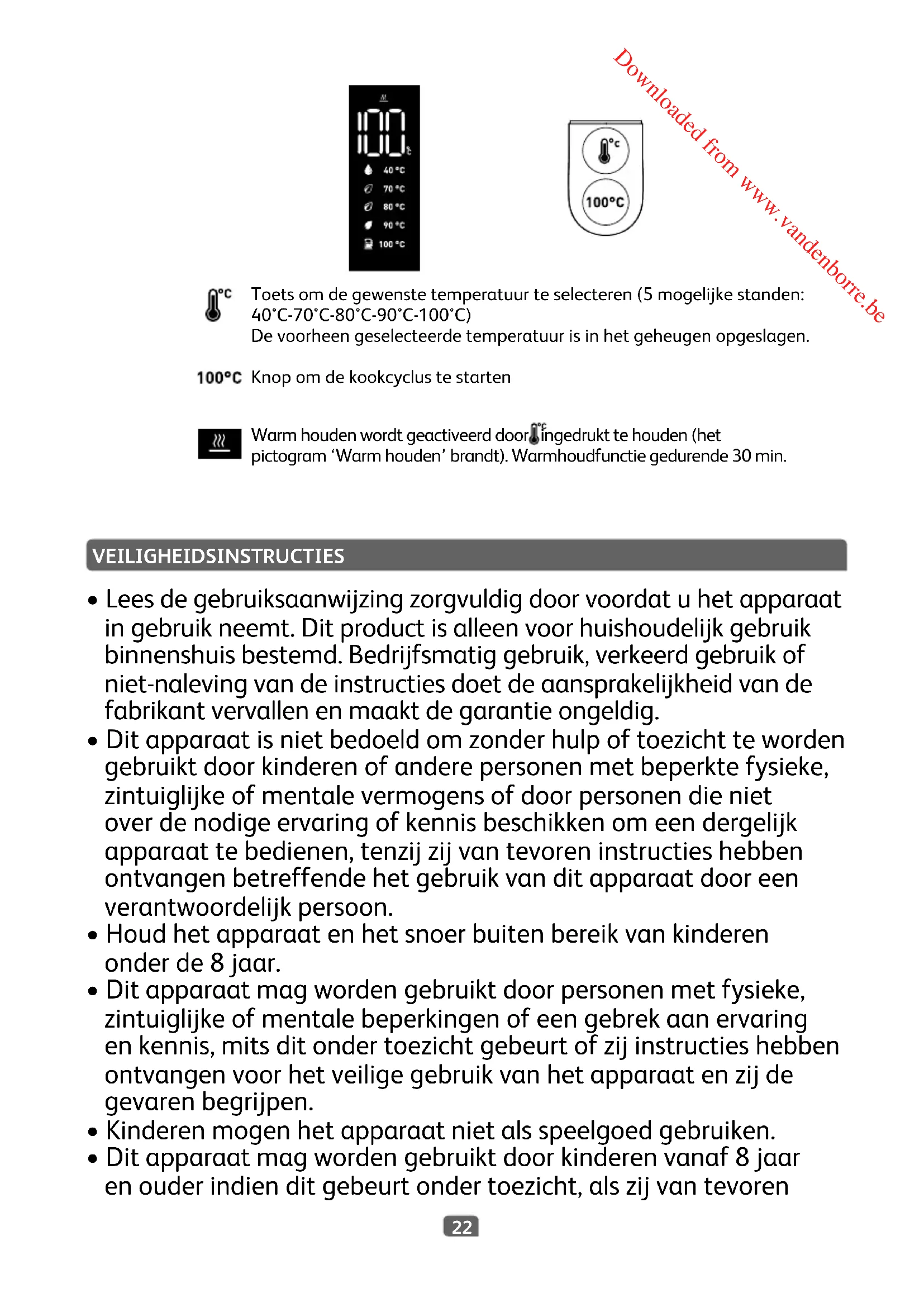 - Dit apparaat mag worden gebruikt door kinderen vanaf 8 jaar en ouder indien dit gebeurt onder toezicht, als zij van tevoren VEILIGHEIDSINSTRUCTIES Toets om de gewenste temperatuur te selecteren (5 mogelijke standen: 40°C-70°C-80°C-90°C-100°C) De voorheen geselecteerde temperatuur is in het geheugen opgeslagen. Knop om de kookcyclus te starten Warm houden wordt geactiveerd door ingedrukt te houden (het pictogram ‘Warm houden’ brandt). Warmhoudfunctie gedurende 30 min. Downloaded from www.vandenborre.be23 instructies hebben ontvangen betreffende het veilige gebruik van het apparaat en als zij de mogelijke gevaren kennen. Reiniging en onderhoud mogen niet worden uitgevoerd door kinderen tenzij ze 8jaar of ouder zijn en onder toezicht van een volwassene staan.