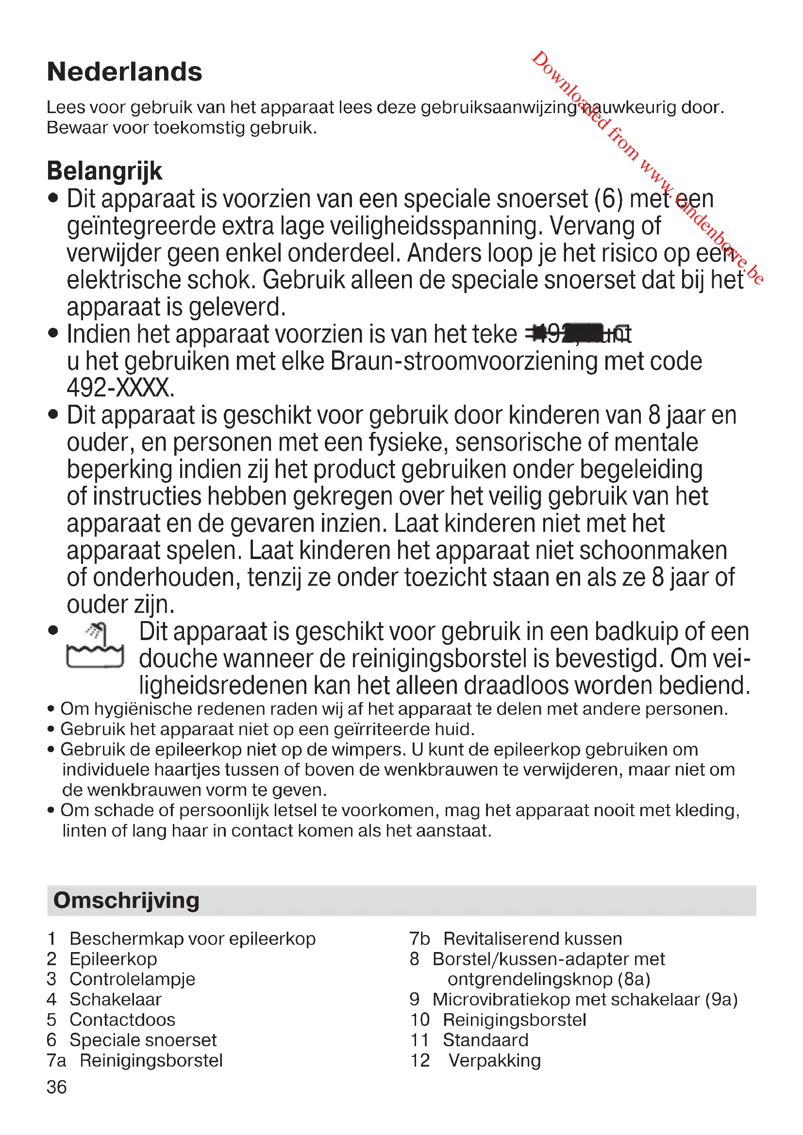 Dit apparaat is voorzien van een speciale snoerset (6) met een geïntegreerde extra lage veiligheidsspanning. Vervang of verwijder geen enkel onderdeel. Anders loop je het risico op een elektrische schok. Gebruik alleen de speciale snoerset dat bij het apparaat is geleverd.