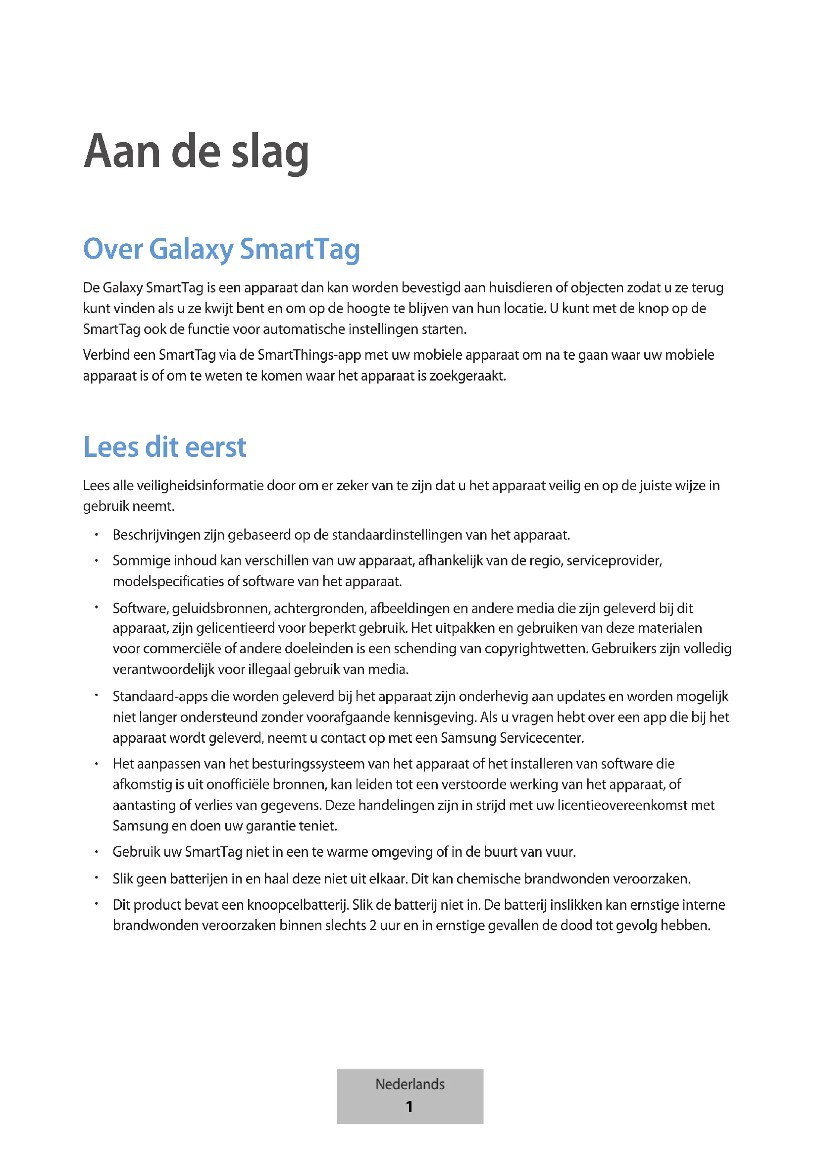 Aan de slag Over Galaxy SmartTag De Galaxy SmartTag is een apparaat dan kan worden bevestigd aan huisdieren of objecten zodat u ze terug kunt vinden als u ze kwijt bent en om op de hoogte te blijven van hun locatie. U kunt met de knop op de SmartTag ook de functie voor automatische instellingen starten. Verbind een SmartTag via de SmartThings-app met uw mobiele apparaat om na te gaan waar uw mobiele apparaat is of om te weten te komen waar het apparaat is zoekgeraakt. Lees dit eerst Lees alle veiligheidsinformatie door om er zeker van te zijn dat u het apparaat veilig en op de juiste wijze in gebruik neemt.
