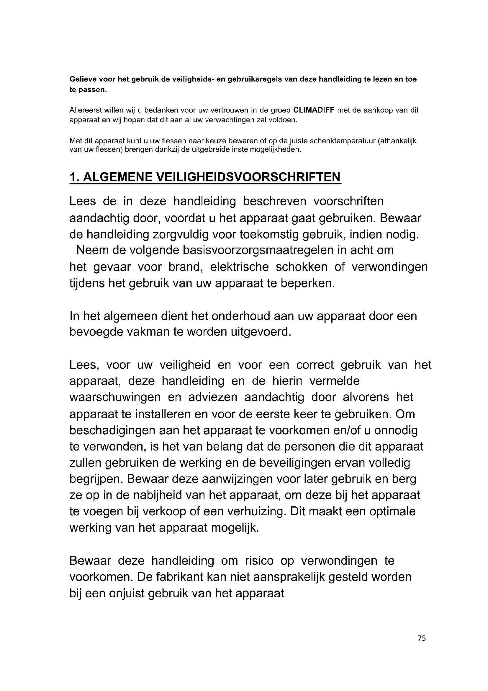 Gelieve voor het gebruik de veiligheids- en gebruiksregels van deze handleiding te lezen en toe te passen. Allereerst willen wij u bedanken voor uw vertrouwen in de groep CLIMADIFF met de aankoop van dit apparaat en wij hopen dat dit aan al uw verwachtingen zal voldoen. Met dit apparaat kunt u uw flessen naar keuze bewaren of op de juiste schenktemperatuur (afhankelijk van uw flessen) brengen dankzij de uitgebreide instelmogelijkheden.