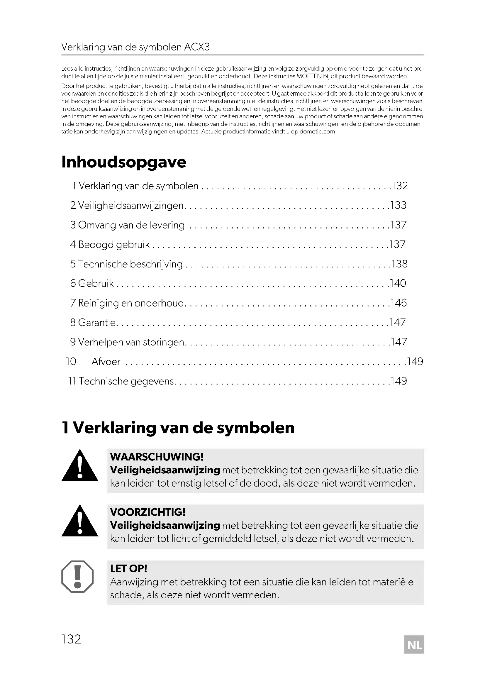 - Kinderen mogen niet met het toestel spelen. INSTRUCTIE Meer informatie over de bediening van het product. DometicACX3_30-ACX3_40-ACX3_40G_OPM_4445103211_EMEA16_202x-xx-xx.book Seite 133 Donnerstag, 15. Juli 2021 5:12 17NL Veiligheidsaanwijzingen ACX3