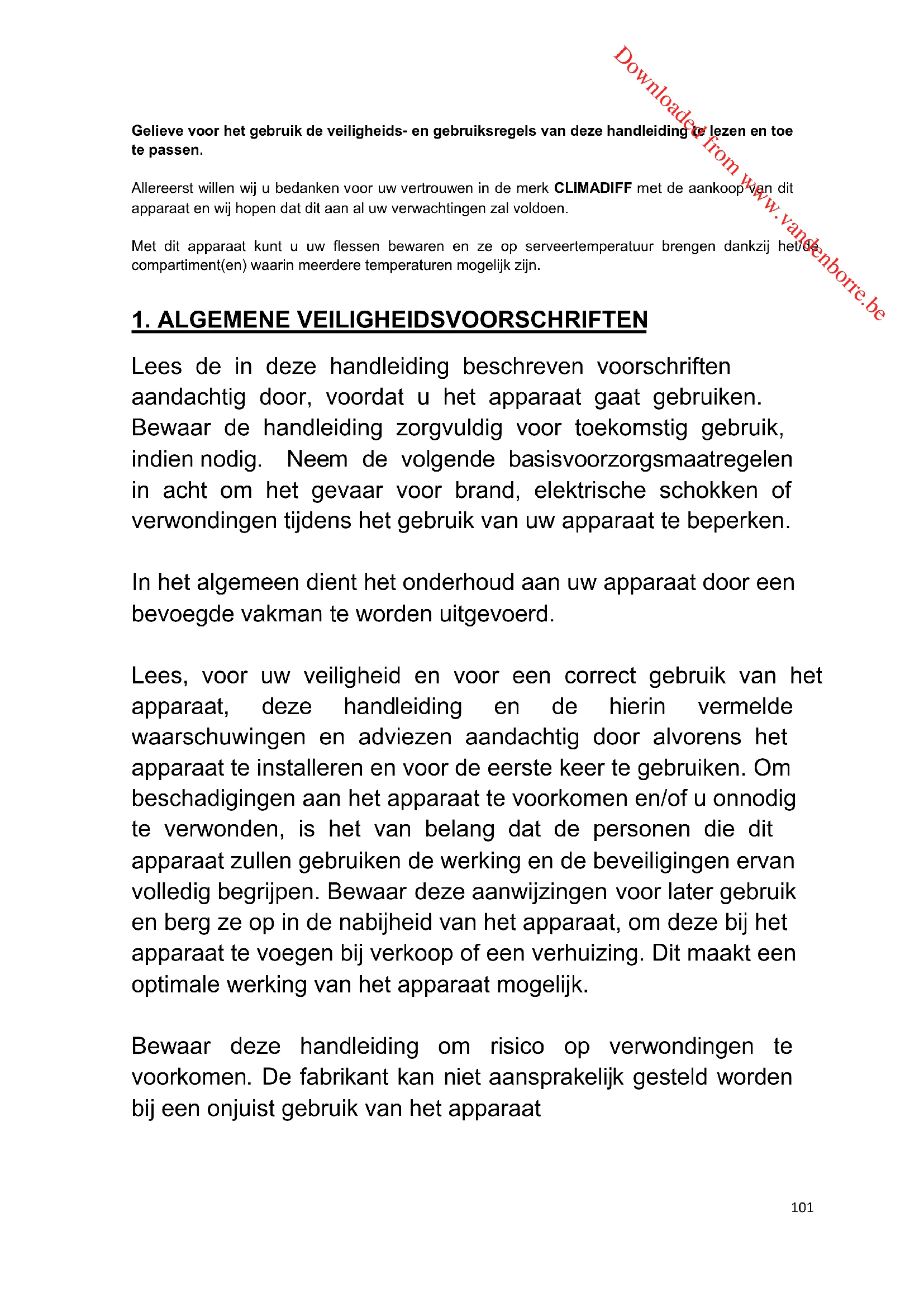 Downloaded from www.vandenborre.be101 Gelieve voor het gebruik de veiligheids- en gebruiksregels van deze handleiding te lezen en toe te passen. Allereerst willen wij u bedanken voor uw vertrouwen in de merk CLIMADIFF met de aankoop van dit apparaat en wij hopen dat dit aan al uw verwachtingen zal voldoen. Met dit apparaat kunt u uw flessen bewaren en ze op serveertemperatuur brengen dankzij het/de compartiment(en) waarin meerdere temperaturen mogelijk zijn.