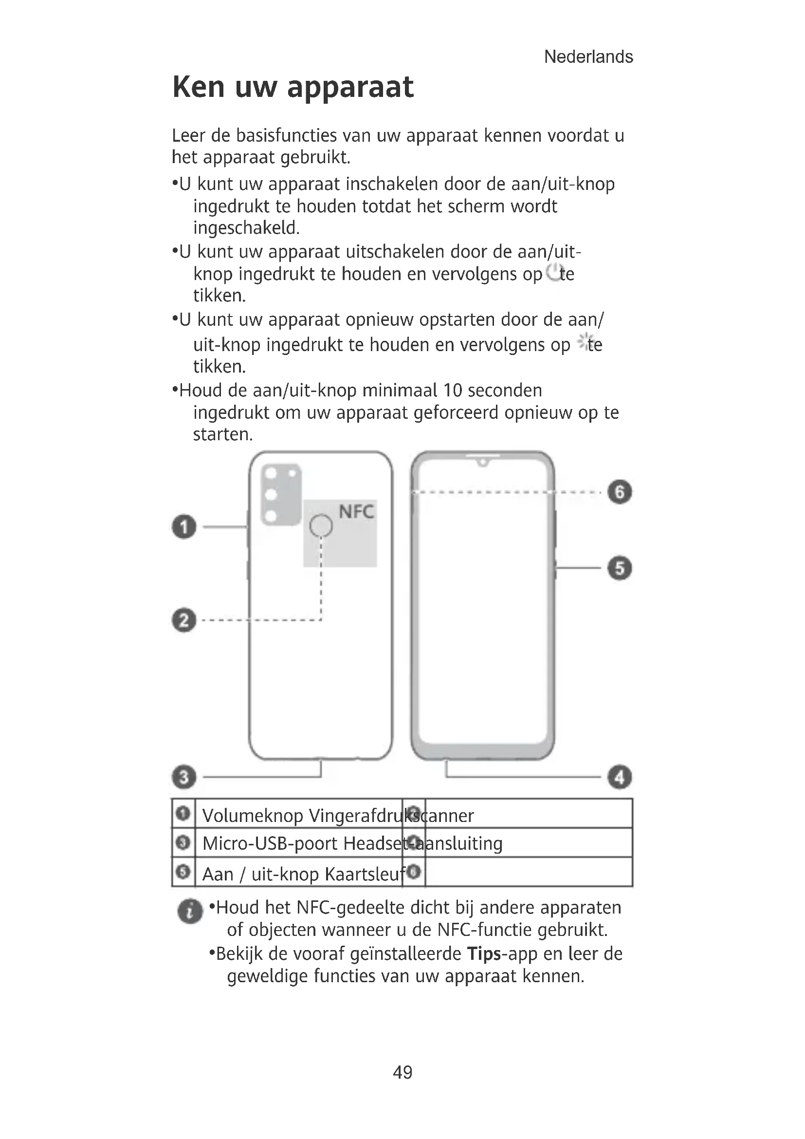 - Houd de aan/uit-knop minimaal 10 seconden ingedrukt om uw apparaat geforceerd opnieuw op te starten. Volumeknop Vingerafdrukscanner Micro-USB-poort Headset-aansluiting Aan / uit-knop Kaartsleuf
