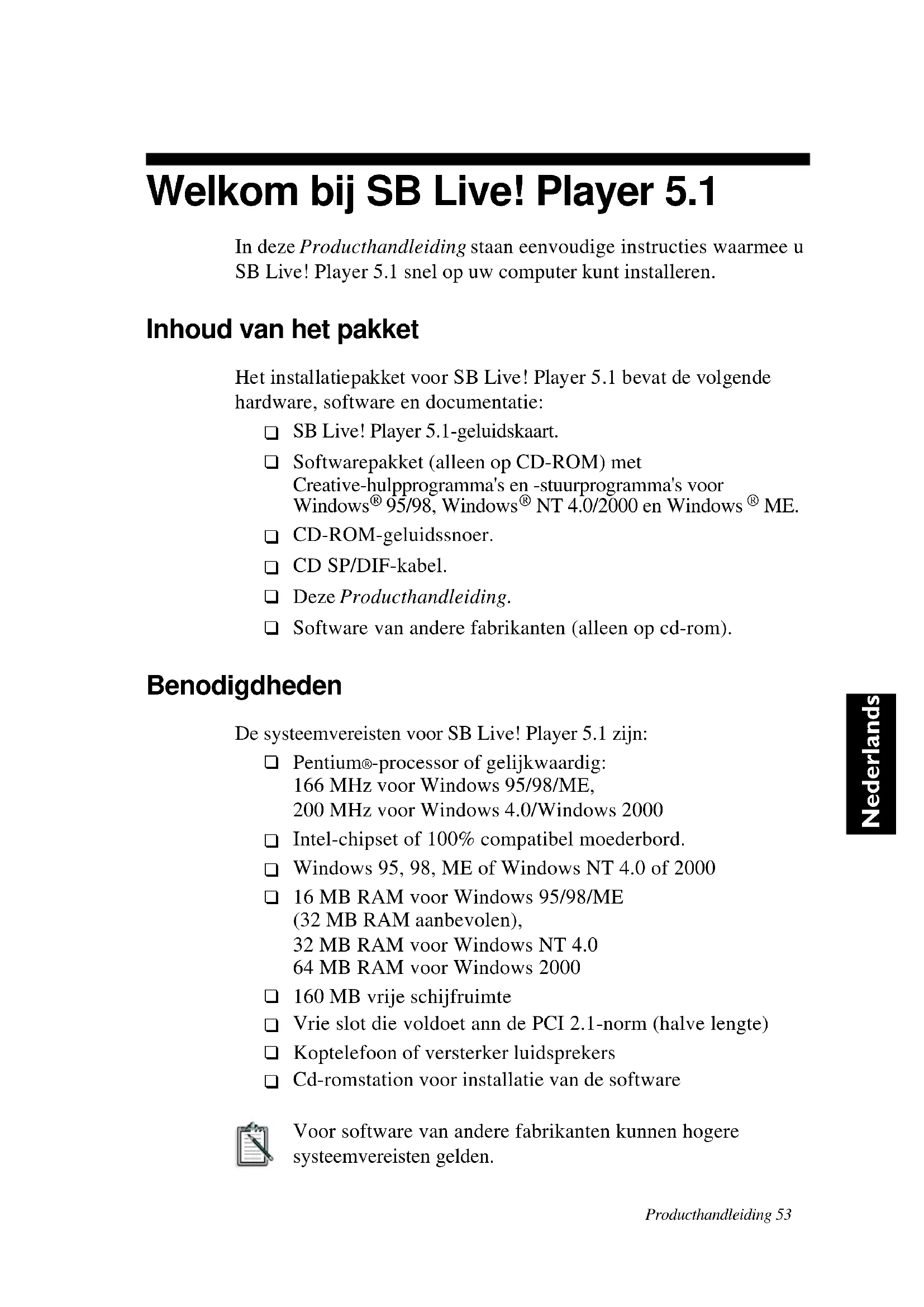 Mocht u meer gedetailleerde informatie vereisen over de installatie en het gebruik van uw SB Live! Player 5.1-geluidskaart, dan raadpleegt u de on line handleiding Handboek met SB Live! Player 5.1 op uw installatie-CD. Voer het volgende programma uit in Windows 95/98/NT 4.0, 2000 en Windows ME. Dubbel klik op het .exe bestand onder