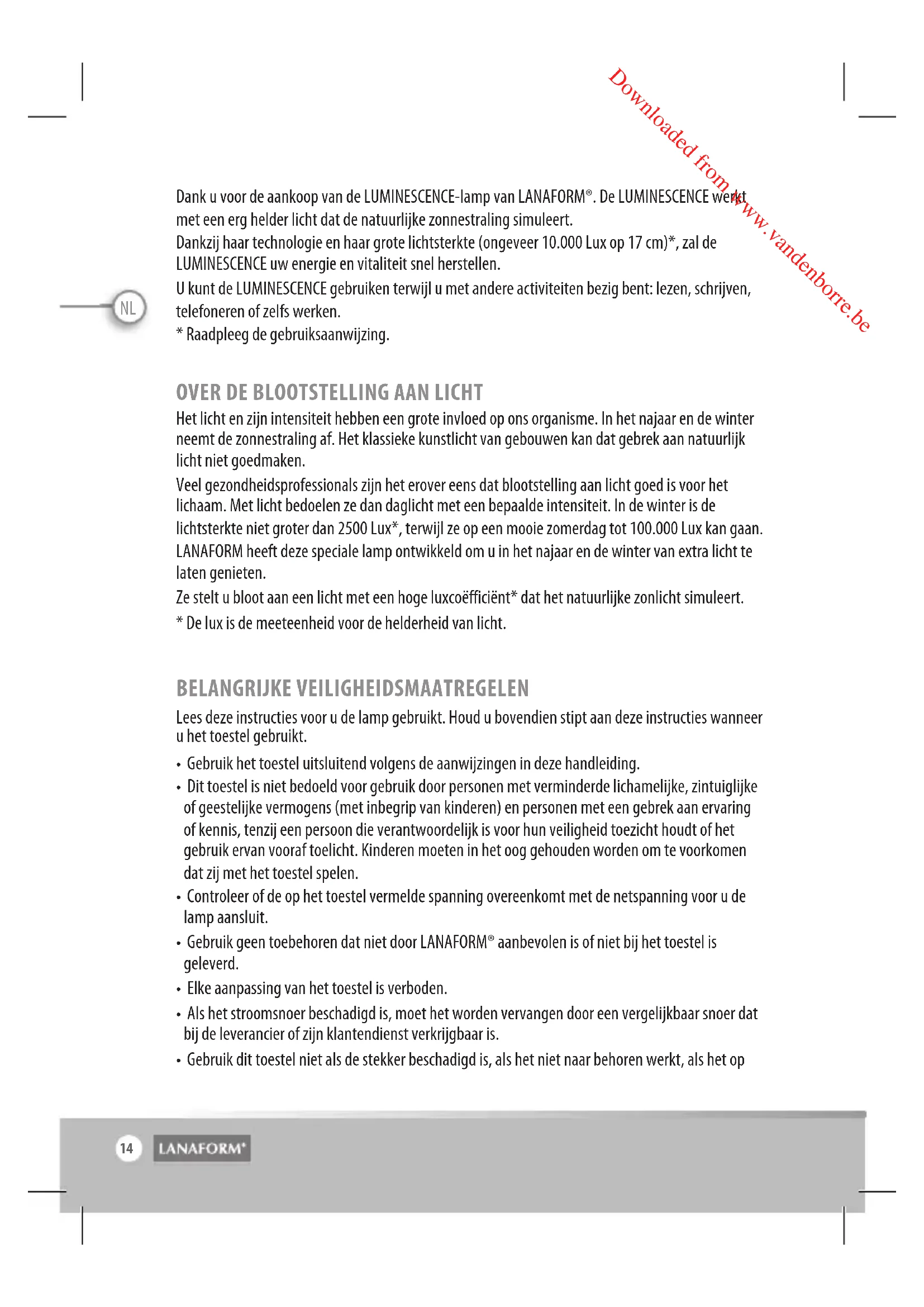 Downloaded from www.vandenborre.beNL Dank u voor de aankoop van de LUMINESCENCE-lamp van LANAFORM®. De LUMINESCENCE werkt met een erg helder licht dat de natuurlijke zonnestraling simuleert. Dankzij haar technologie en haar grote lichtsterkte (ongeveer 10.000 Lux op 17 cm)*, zal de LUMINESCENCE uw energie en vitaliteit snel herstellen. U kunt de LUMINESCENCE gebruiken terwijl u met andere activiteiten bezig bent: lezen, schrijven, telefoneren of zelfs werken.