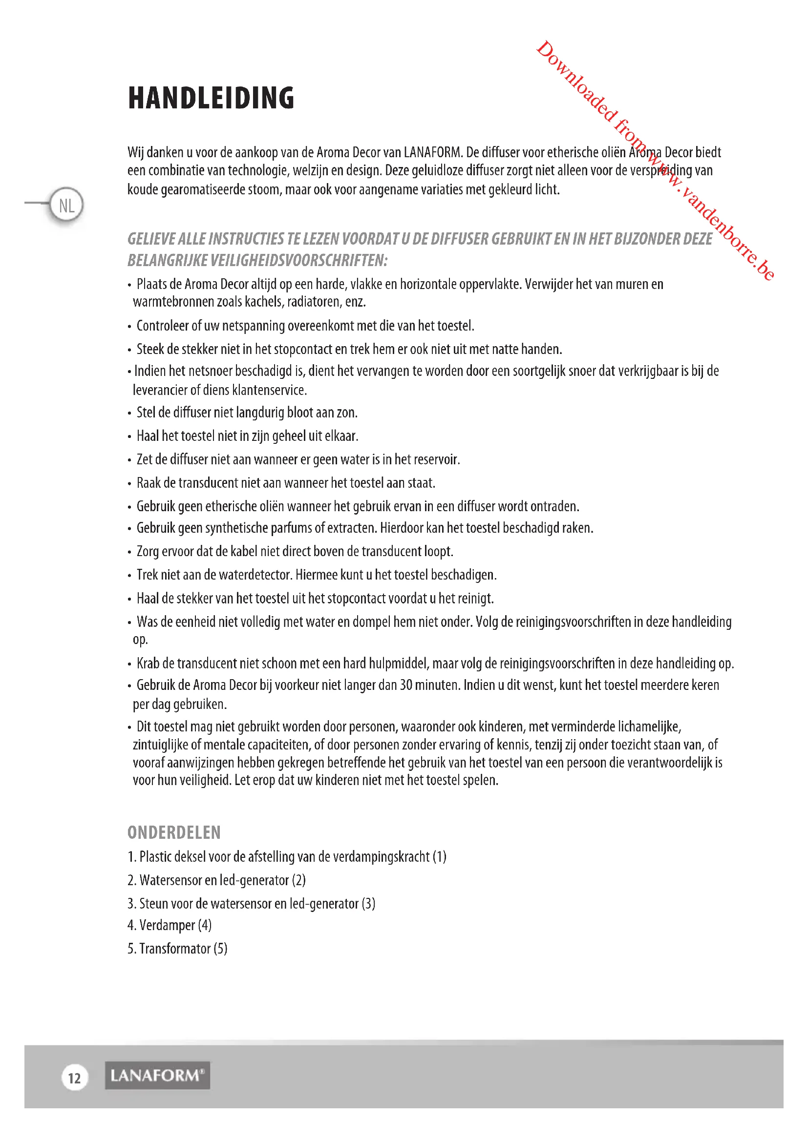 Downloaded from www.vandenborre.beNL HANDLEIDING Wij danken u voor de aankoop van de Aroma Decor van LANAFORM. De diffuser voor etherische oliën Aroma Decor biedt een combinatie van technologie, welzijn en design. Deze geluidloze diffuser zorgt niet alleen voor de verspreiding van koude gearomatiseerde stoom, maar ook voor aangename variaties met gekleurd licht. GELIEVE ALLE INSTRUCTIES TE LEZEN VOORDAT U DE DIFFUSER GEBRUIKT EN IN HET BIJZONDER DEZE BELANGRIJKE VEILIGHEIDSVOORSCHRIFTEN:
