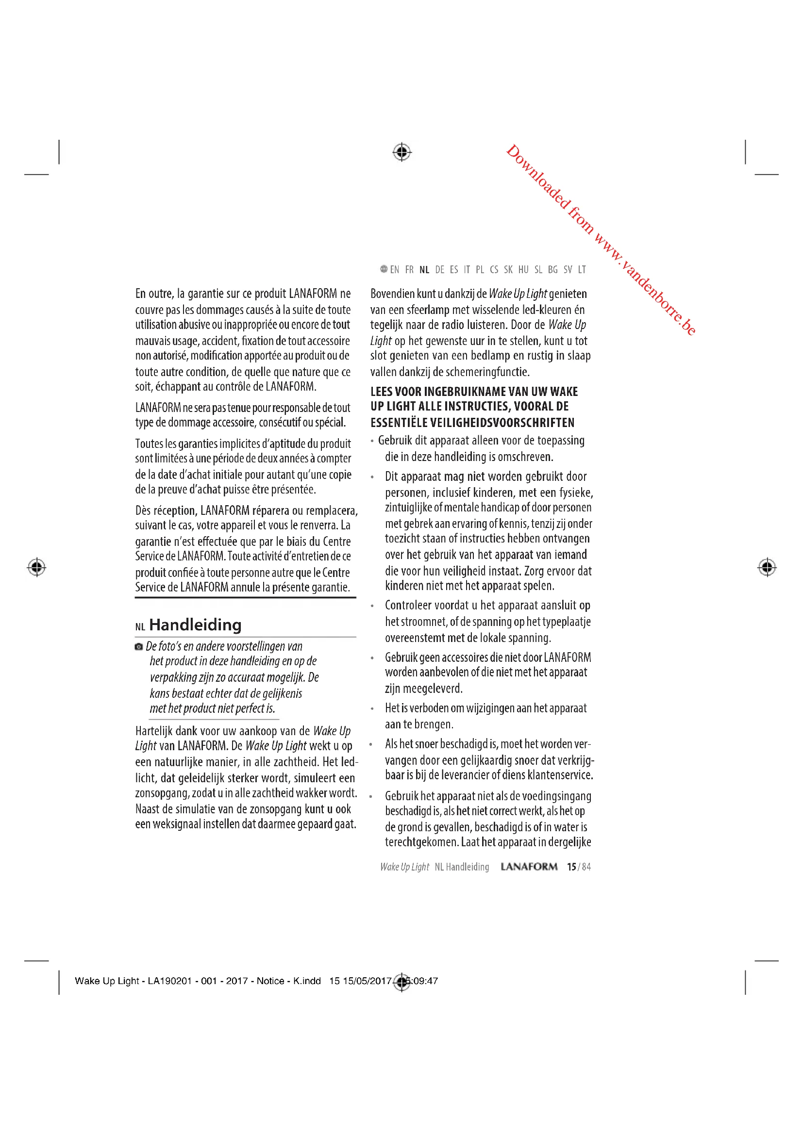 Gebruik het apparaat niet als de voedingsingang beschadigd is, als het niet correct werkt, als het op de grond is gevallen, beschadigd is of in water is terechtgekomen. Laat het apparaat in dergelijke Wake Up Light - LA190201 - 001 - 2017 - Notice - K.indd 15 15/05/2017 15:09:47 Downloaded from www.vandenborre.be16 / 84 Wake Up Light NL Handleiding EN FR NL DE ES IT PL CS SK HU SL BG SV LT gevallen nazien en repareren door de (klanten- service van de) leverancier.
