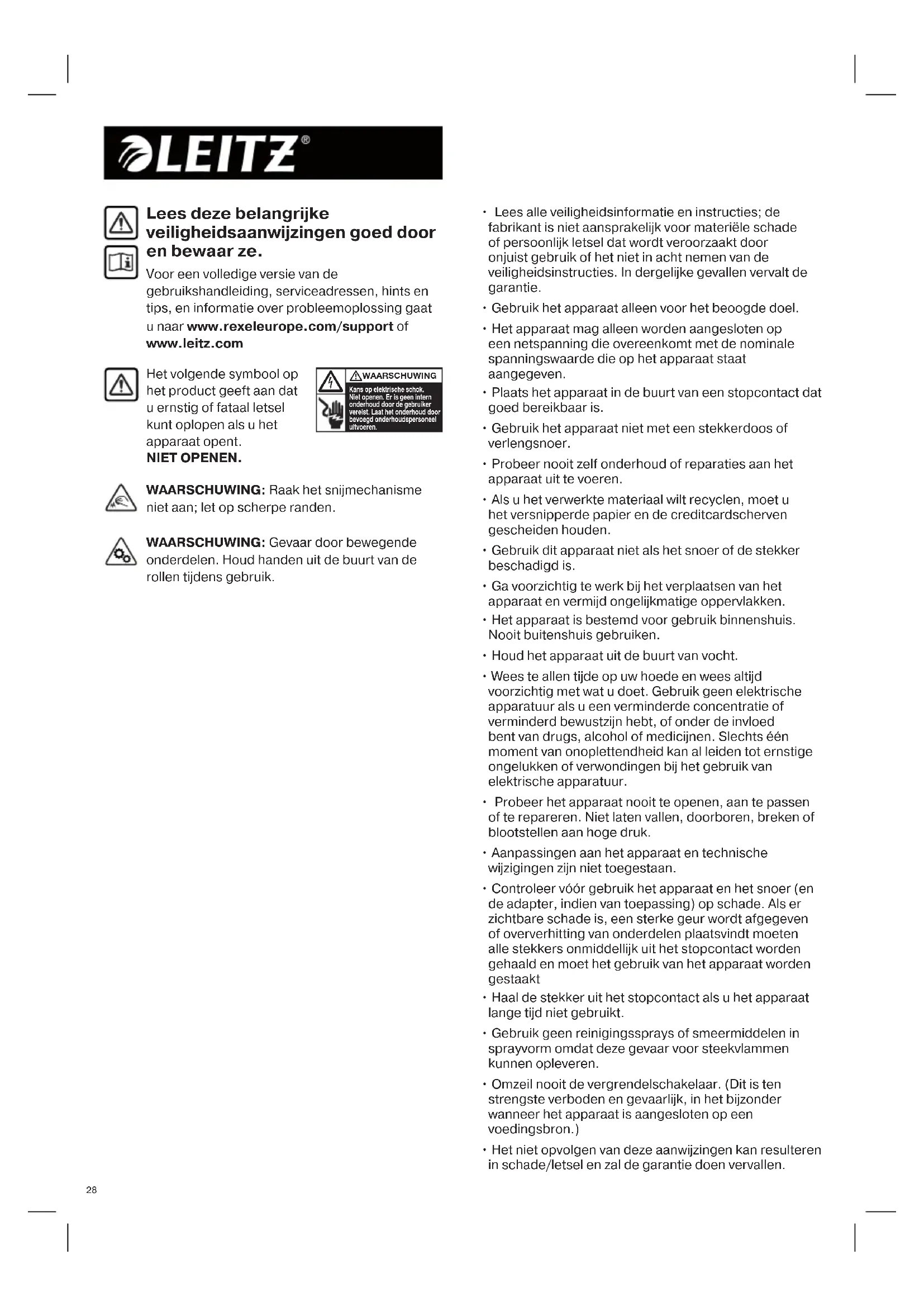 - Het niet opvolgen van deze aanwijzingen kan resulteren in schade/letsel en zal de garantie doen vervallen. Lees deze belangrijke veiligheidsaanwijzingen goed door en bewaar ze. Voor een volledige versie van de gebruikshandleiding, serviceadressen, hints en tips, en informatie over probleemoplossing gaat u naar www.rexeleurope.com/support of www.leitz.com WAARSCHUWING: Raak het snijmechanisme niet aan; let op scherpe randen. WAARSCHUWING: Gevaar door bewegende onderdelen. Houd handen uit de buurt van de rollen tijdens gebruik.2929292929 Houd sieraden uit de buurt van de invoeropening Houd stropdassen en loshangende kleding uit de buurt van de invoeropening Waarschuwingssymbolen Houd lang haar uit de buurt van de invoeropening Steek uw hand niet in de invoeropening Waarschuwingssymbolen Velcapaciteit Geen cd’s Geen heavy-duty nietjes groter dan 26 mm Waarschuwing: bewegende onderdelen Dit apparaat is niet bedoeld voor gebruik door kinderen Gebruik geen spuitbussen in de buurt van het apparaat. Gebruik geen reinigingssprays of smeermiddelen in sprayvorm omdat deze gevaar voor steekvlammen kunnen opleveren. Knoppen en indicatoren Geen creditcards Accessoires Gebruik alleen Leitz-accessoires: Smeervellen - 8007 00 00 Icoon Type Model Schuifknop/indicator en handeling Bedieningsknoppen 11,12,13 Knop voor automatisch starten en stand-by (eenmaal drukken) Terugloopfunctie (snijmechanisme werkt in achterwaartse richting) Vooruit (snijmechanisme werkt in voorwaartse richting) Oververhittingsindicator (papiervernietiger laten afkoelen) Indicator te veel papier/ papierstoring (vellen papier verwijderen/ papierstoring verhelpen) Indicator opvangbak vol (deur openen of kop met snijmechanisme van apparaat tillen en opvangbak leegmaken) Indicator deur open/ kop met snijmechanisme verwijderd (deur goed sluiten)30 Dik papier of karton met een maximale dikte van 200 g/m². Meerdere gevouwen vellen (dubbelgevouwen A3-vellen). Glanzend papier of een vel dat aan beide zijden is bedrukt. Cd’s en dvd’s Gebruik geen spuitbussen Geen olie, alleen olievellen Versnipperingscapaciteit KAN het volgende versnipperen: