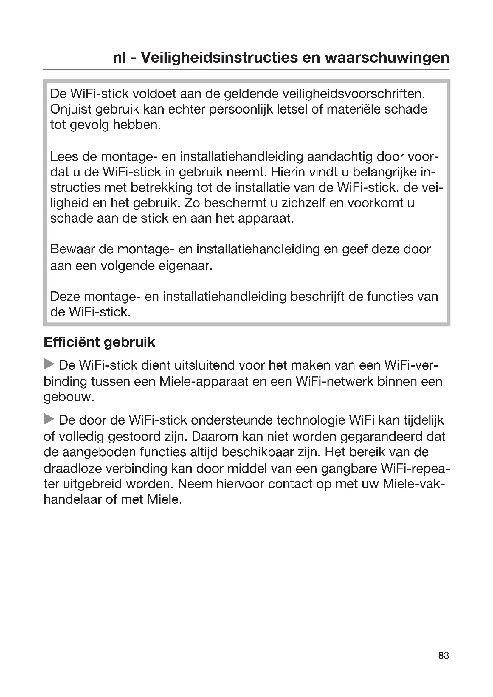 De WiFi-stick voldoet aan de geldende veiligheidsvoorschriften. Onjuist gebruik kan echter persoonlijk letsel of materiële schade tot gevolg hebben. Lees de montage- en installatiehandleiding aandachtig door voor- dat u de WiFi-stick in gebruik neemt. Hierin vindt u belangrijke in- structies met betrekking tot de installatie van de WiFi-stick, de vei- ligheid en het gebruik. Zo beschermt u zichzelf en voorkomt u schade aan de stick en aan het apparaat. Bewaar de montage- en installatiehandleiding en geef deze door aan een volgende eigenaar. Deze montage- en installatiehandleiding beschrijft de functies van de WiFi-stick. Efficiënt gebruik De WiFi-stick dient uitsluitend voor het maken van een WiFi-ver- binding tussen een Miele-apparaat en een WiFi-netwerk binnen een gebouw. De door de WiFi-stick ondersteunde technologie WiFi kan tijdelijk of volledig gestoord zijn. Daarom kan niet worden gegarandeerd dat de aangeboden functies altijd beschikbaar zijn. Het bereik van de draadloze verbinding kan door middel van een gangbare WiFi-repea- ter uitgebreid worden. Neem hiervoor contact op met uw Miele-vak- handelaar of met Miele.nl - Veiligheidsinstructies en waarschuwingen
