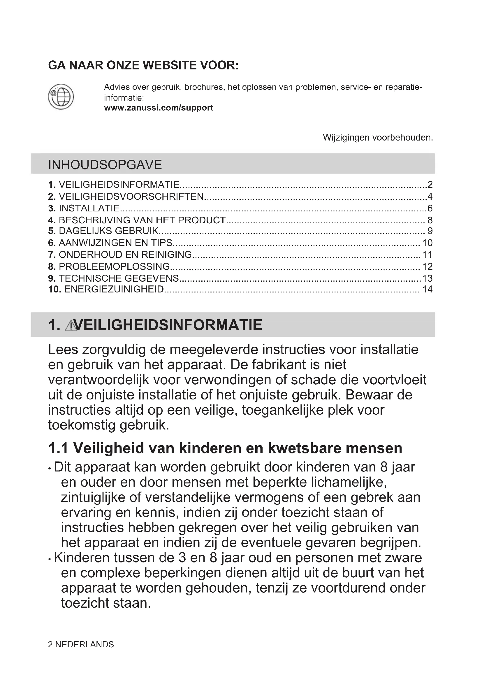 Recycleer de materialen met het symbool . Gooi de verpakking in een geschikte afvalcontainer om het te recycleren. Bescherm het milieu en de volksgezondheid en recycleer op een correcte manier het afval van elektrische en elektronische apparaten. Gooi apparaten gemarkeerd met het symbool niet weg met het huishoudelijk afval. Breng het product naar het milieustation bij u in de buurt of neem contact op met de gemeente. 14 NEDERLANDSVISITEZ NOTRE SITE WEB POUR : Obtenir des conseils d’utilisation, des brochures, un dépanneur, des informations surle service et les réparations :www.zanussi.com/supportSous réserve de modifications.
