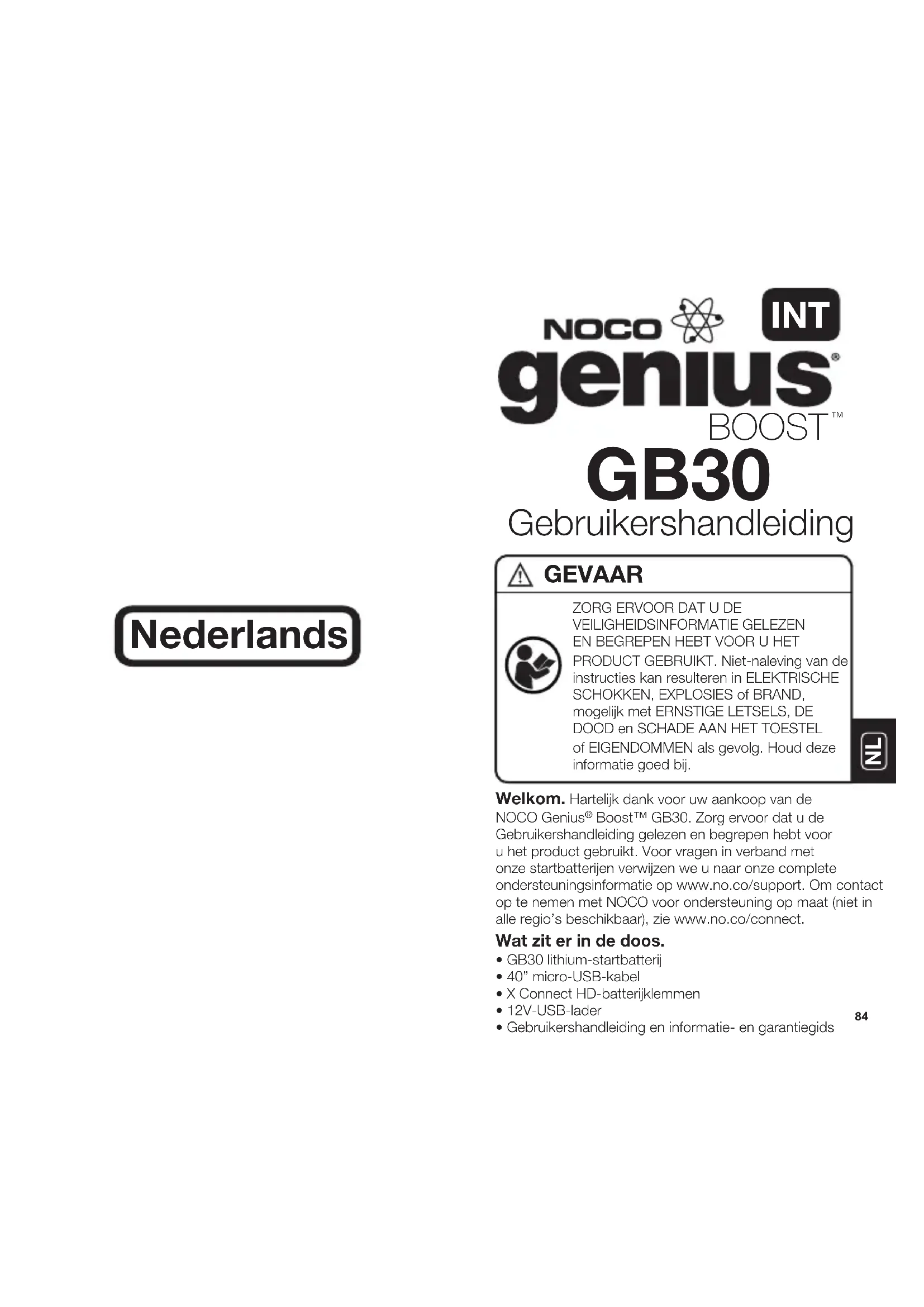 Welkom. Hartelijk dank voor uw aankoop van de NOCO Genius Boost™ GB30. Zorg ervoor dat u de Gebruikershandleiding gelezen en begrepen hebt voor u het product gebruikt. Voor vragen in verband met onze startbatterijen verwijzen we u naar onze complete ondersteuningsinformatie op www.no.co/support. Om contact op te nemen met NOCO voor ondersteuning op maat (niet in alle regio’s beschikbaar), zie www.no.co/connect.Wat zit er in de doos.• GB30 lithium-startbatterij• 40” micro-USB-kabel• X Connect HD-batterijklemmen• 12V-USB-lader• Gebruikershandleiding en informatie- en garantiegidsZORG ERVOOR DAT U DE VEILIGHEIDSINFORMATIE GELEZEN EN BEGREPEN HEBT VOOR U HET PRODUCT GEBRUIKT. Niet-naleving van de instructies kan resulteren in ELEKTRISCHE SCHOKKEN, EXPLOSIES of BRAND, mogelijk met ERNSTIGE LETSELS, DE DOOD en SCHADE AAN HET TOESTEL of EIGENDOMMEN als gevolg. Houd deze informatie goed bij. GEVAAR Gebruikershandleiding GB30 BOOST