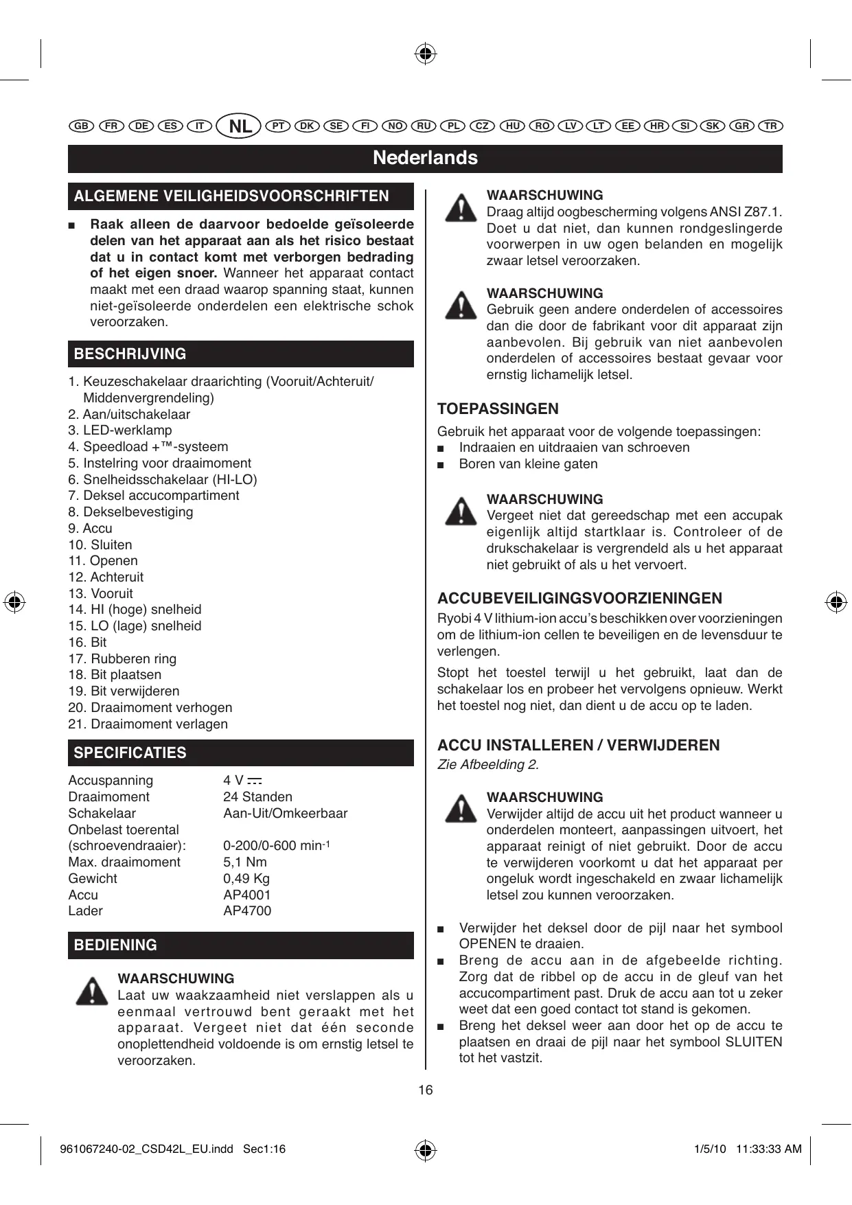 GEBRUIKSAANWIJZING CSD 40 LI, CSD42L RYOBI