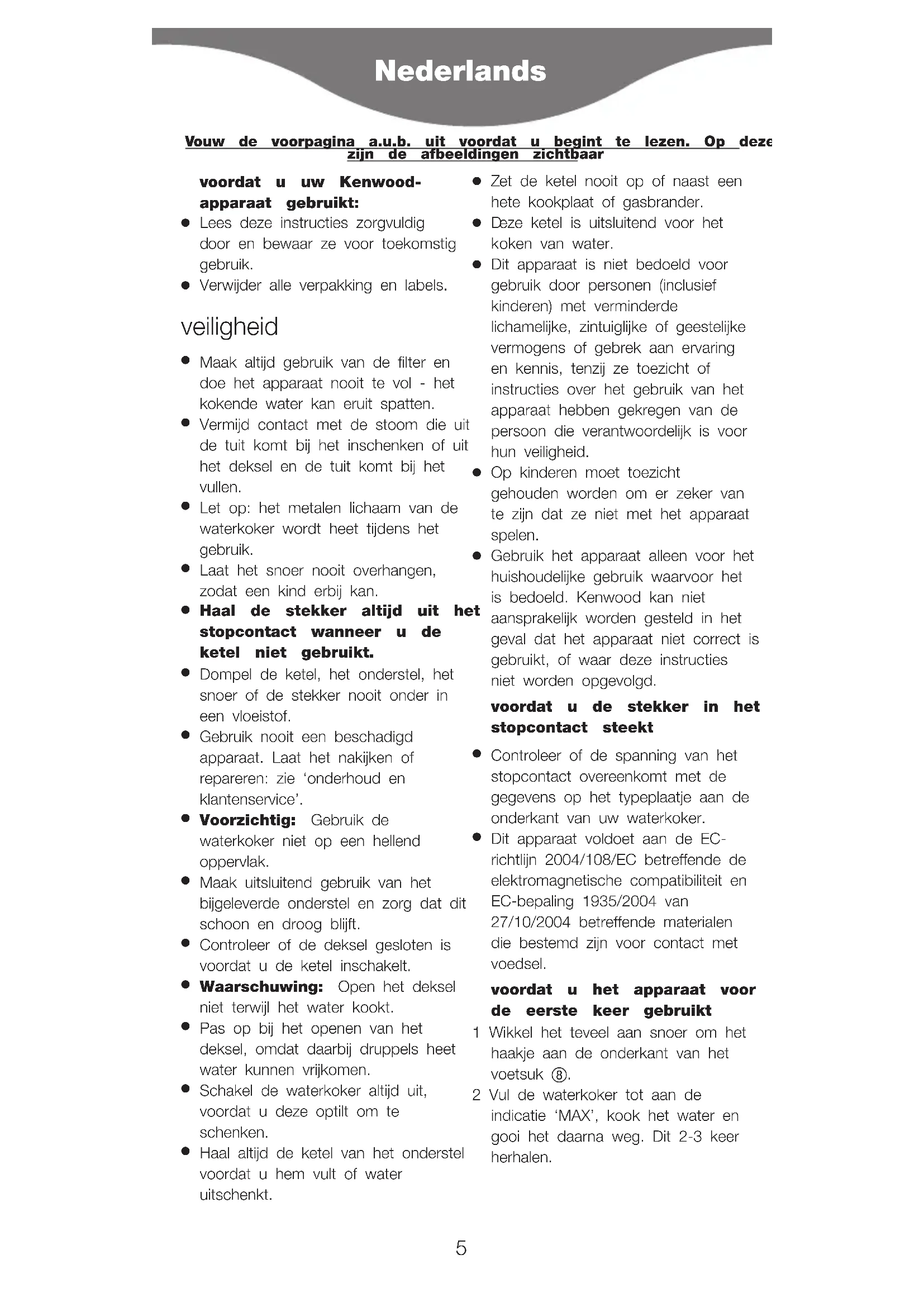 Dit apparaat voldoet aan de EC- richtlijn 2004/108/EC betreffende de elektromagnetische compatibiliteit en EC-bepaling 1935/2004 van 27/10/2004 betreffende materialen die bestemd zijn voor contact met voedsel. voordat u het apparaat voor de eerste keer gebruikt 1 Wikkel het teveel aan snoer om het haakje aan de onderkant van het voetsuk 햹. 2 Vul de waterkoker tot aan de indicatie ‘MAX’, kook het water en gooi het daarna weg. Dit 2-3 keer herhalen. Nederlands