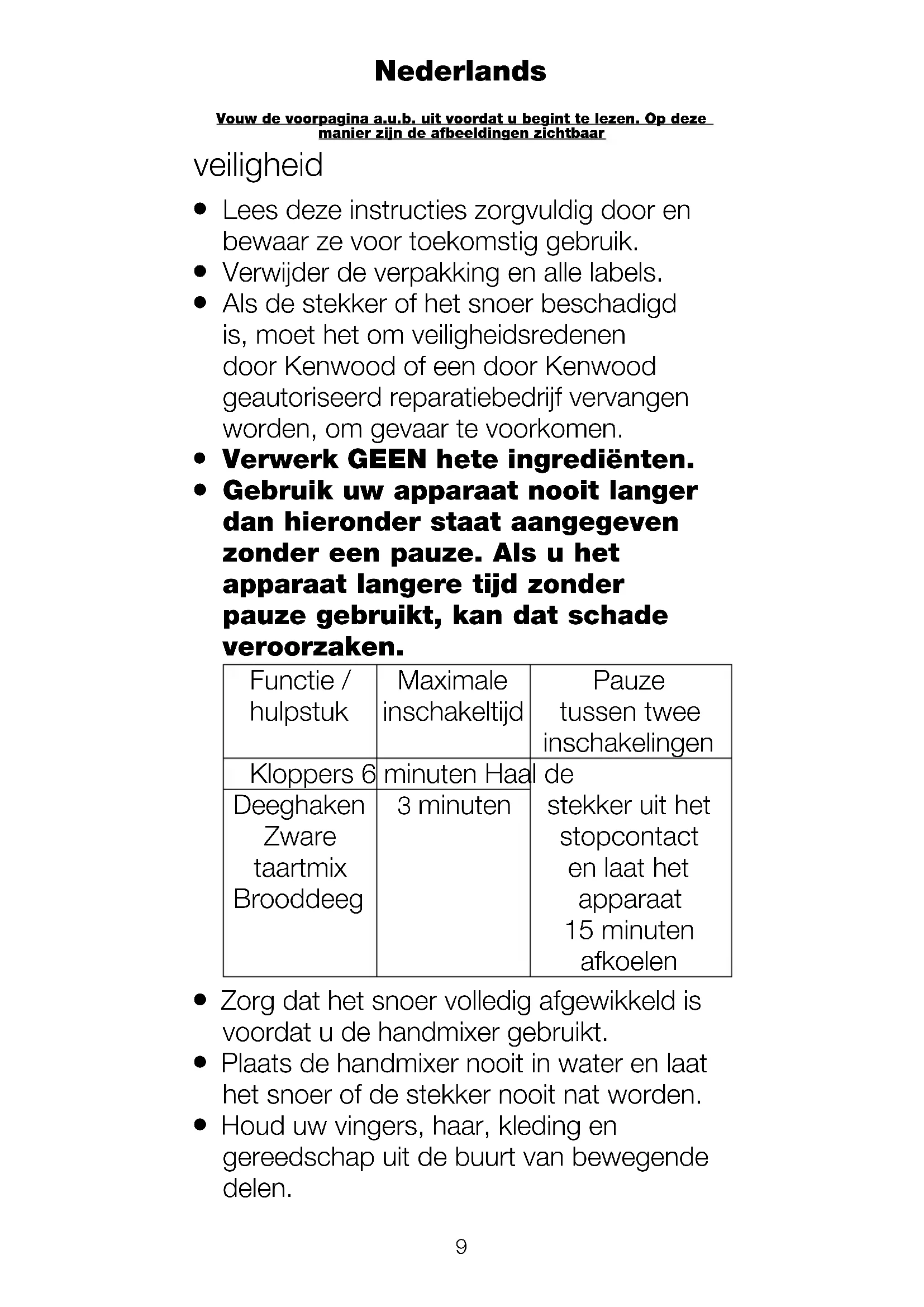 Houd uw vingers, haar, kleding en gereedschap uit de buurt van bewegende delen. Vouw de voorpagina a.u.b. uit voordat u begint te lezen. Op deze manier zijn de afbeeldingen zichtbaar Nederlands10