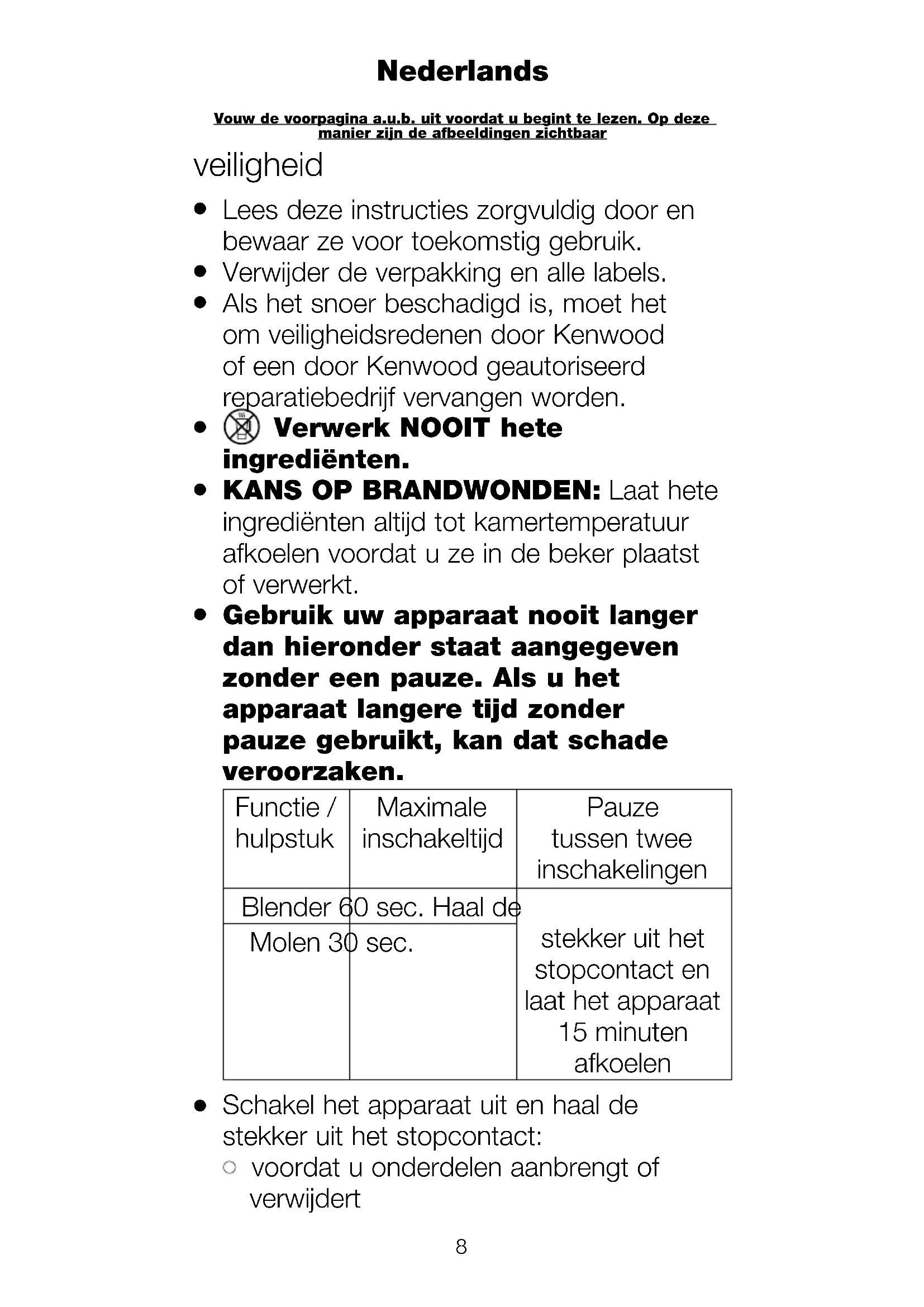 Gebruik uw apparaat nooit langer dan hieronder staat aangegeven zonder een pauze. Als u het apparaat langere tijd zonder pauze gebruikt, kan dat schade veroorzaken. Functie / hulpstuk Maximale inschakeltijd Pauze tussen twee inschakelingen Blender 60 sec. Haal de stekker uit het stopcontact en laat het apparaat 15 minuten afkoelen Molen 30 sec.