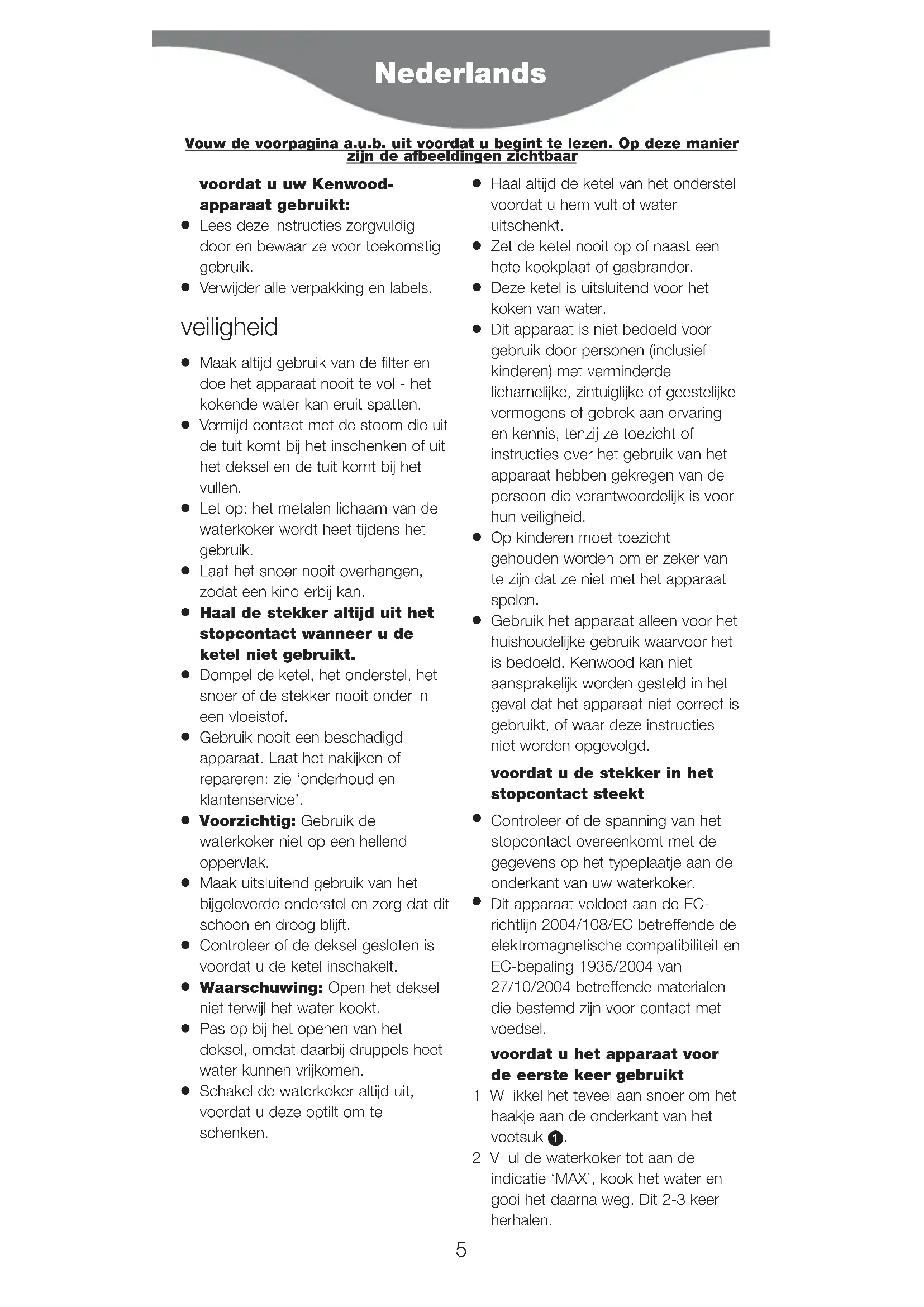Dit apparaat voldoet aan de EC- richtlijn 2004/108/EC betreffende de elektromagnetische compatibiliteit en EC-bepaling 1935/2004 van 27/10/2004 betreffende materialen die bestemd zijn voor contact met voedsel. voordat u het apparaat voor de eerste keer gebruikt 1Wikkel het teveel aan snoer om het haakje aan de onderkant van het voetsuk . 2Vul de waterkoker tot aan de indicatie ‘MAX’, kook het water en gooi het daarna weg. Dit 2-3 keer herhalen. Nederlands