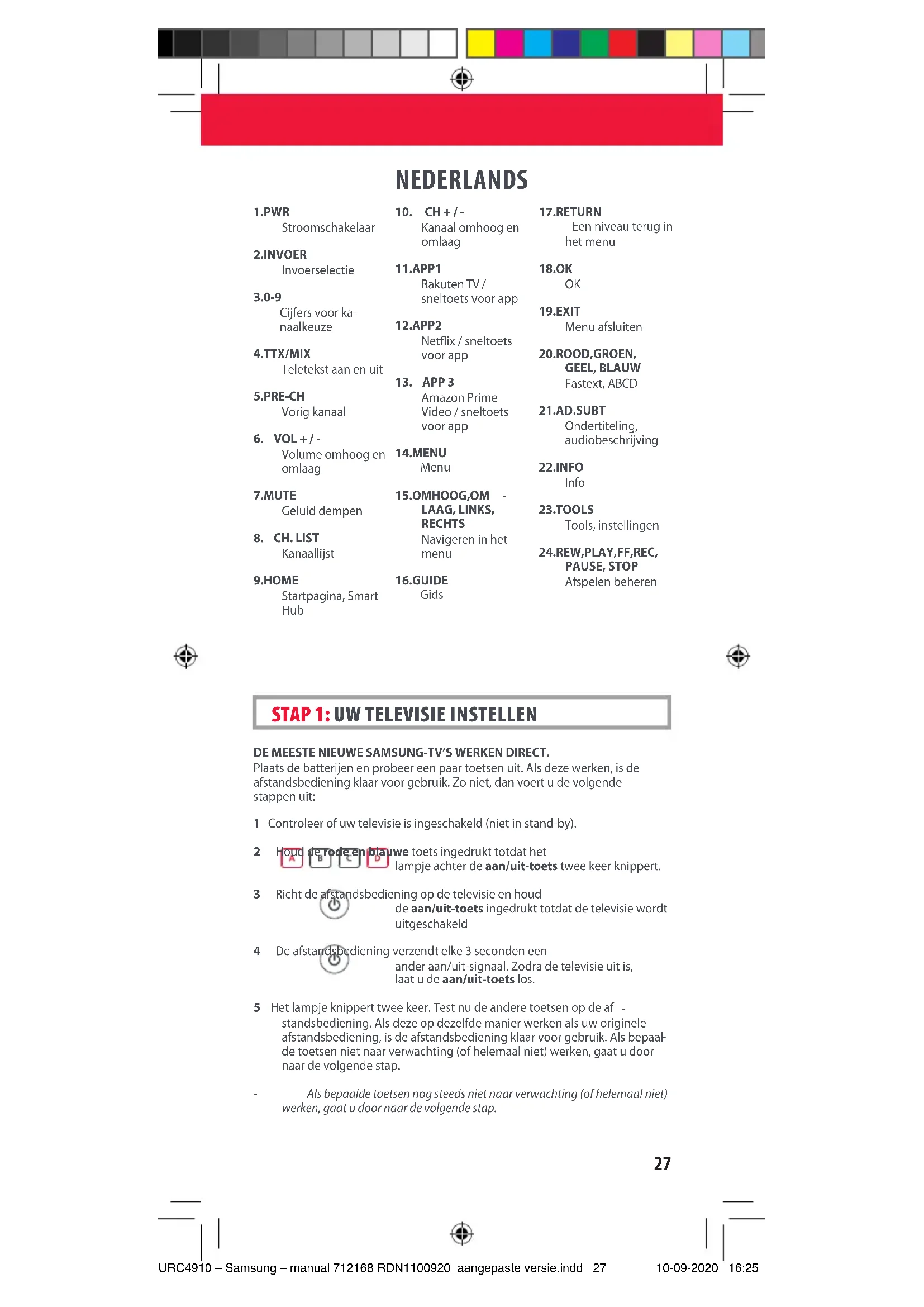 ripristinato. ITALIANO URC4910 – Samsung – manual 712168 RDN1100920_aangepaste versie.indd 26URC4910 – Samsung – manual 712168 RDN1100920_aangepaste versie.indd 26 10-09-2020 16:2510-09-2020 16:2527 NEDERLANDS DE MEESTE NIEUWE SAMSUNG-TV’S WERKEN DIRECT. Plaats de batterijen en probeer een paar toetsen uit. Als deze werken, is de afstandsbediening klaar voor gebruik. Zo niet, dan voert u de volgende stappen uit: 1 Controleer of uw televisie is ingeschakeld (niet in stand-by). 2 Houd de rode en blauwe toets ingedrukt totdat het lampje achter de aan/uit-toets twee keer knippert. 3 Richt de afstandsbediening op de televisie en houd de aan/uit-toets ingedrukt totdat de televisie wordt uitgeschakeld 4 De afstandsbediening verzendt elke 3 seconden een ander aan/uit-signaal. Zodra de televisie uit is, laat u de aan/uit-toets los. 5 Het lampje knippert twee keer. Test nu de andere toetsen op de af