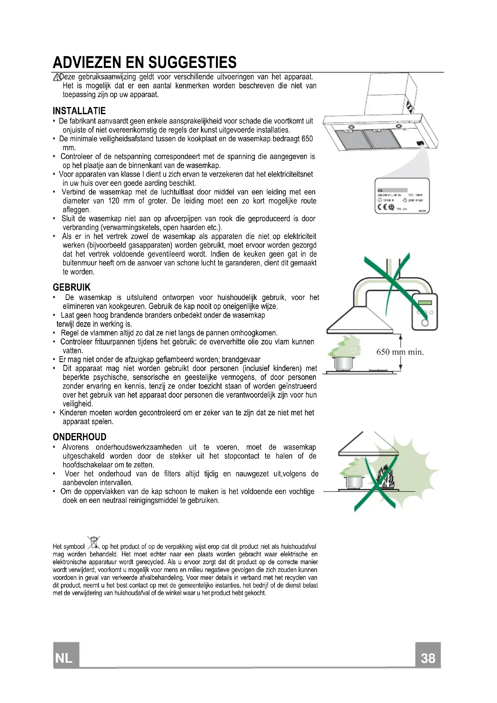- De fabrikant aanvaardt geen enkele aansprakelijkheid voor schade die voortkomt uit onjuiste of niet overeenkomstig de regels der kunst uitgevoerde installaties. • De minimale veiligheidsafstand tussen de kookplaat en de wasemkap bedraagt 650 mm.
