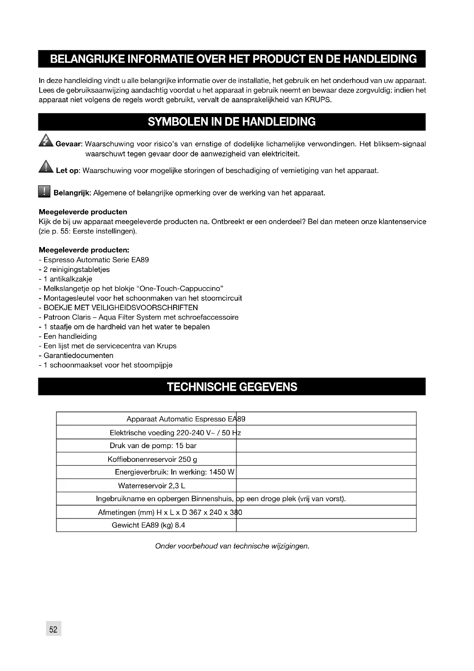 - Patroon Claris – Aqua Filter System met schroefaccessoire - 1 staafje om de hardheid van het water te bepalen - Een handleiding - Een lijst met de servicecentra van Krups - Garantiedocumenten - 1 schoonmaakset voor het stoompijpje TECHNISCHE GEGEVENS Apparaat Automatic Espresso EA89 Elektrische voeding 220-240 V~ / 50 Hz Druk van de pomp: 15 bar Kofebonenreservoir 250 g Energieverbruik: In werking: 1450 W Waterreservoir 2,3 L Ingebruikname en opbergen Binnenshuis, op een droge plek (vrij van vorst). Afmetingen (mm) H x L x D 367 x 240 x 380 Gewicht EA89 (kg) 8.4 Onder voorbehoud van technische wijzigingen.BESCHRIJVING VAN HET APPARAAT A Dekselhandgreep waterreservoirB WaterreservoirC Kofedik-opvangbakD In de hoogte verstelbare kofe-uitgangenE Rooster en afneembare druppelopvangbakF Deksel van het kofebonenreservoirG Afneembaar blok One-Touch CappuccinoH Melkslangetje en mixerI Waterniveauindicator KoffiebonenreservoirJ Regelknop maalgraadK Opening voor schoonmaaktabletL Kofemolen met metalen maalschijven BedieningspaneelM SchermN “Aan/uit”-toetsO AanraaktoetsenDetails over: De druppelopvangbak: vangt het water of de kofe op die tijdens/na de bereiding uit het apparaat loopt. Het is belangrijk dat deze altijd op zijn plaats zit en regelmatig wordt leeggemaakt.