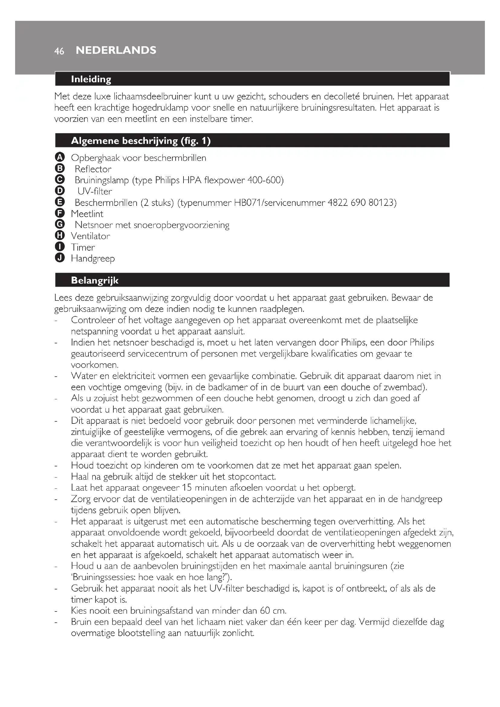 ITALIANO4445 Risoluzione dei guasti Nel caso sorgessero problemi con l’apparecchio che non possono essere risolti con l’aiuto delle informazionisottoriportate,contattateilrivenditorePhilipspiùvicinooppureilCentroAssistenza Clienti Philips del vostro paese. Problema Soluzione L’apparecchio non si accende Assicuratevi di aver inserito correttamente la spina nella presa di corrente. Potrebbetrattarsidiunguastodicorrente.Vericatel’erogazionedi corrente collegando un altro apparecchio elettrico. Èpossibilecheiltimernonsiastatoimpostato.Impostateladuratadella seduta appropriata. Èpossibilechelalampadasiaancoratroppocaldaperriaccendersi. Lasciatelaraffreddareper3minutiprimadiaccenderladinuovo. Scarsi risultati di abbronzatura Èpossibilechelaprolungautilizzatasiatroppolungaol’intensitàdi corrente erogata non sia corretta. Rivolgetevi al vostro rivenditore. Siconsigliaingeneraledinonutilizzareunaprolunga. Èpossibilecheiltipodiabbronzaturasceltononsiaindicatoperilvostro tipodipelle.Consultatelatabella“Seduteabbronzanti:quantevoltee per quanto tempo?”. Èpossibilecheladistanzafrailvisoelalampadasiamaggiorediquella prevista. Dopouncertoperiododiutilizzo,lacapacitàabbronzantedellalampada diminuisce.Questofenomenorisulteràevidentesolodopoalcunianni. Per risolvere questo problema, aumentate la durata della sessione oprovvedeteallasostituzionedellalampada. ITALIANO 4546 Inleiding Metdezeluxelichaamsdeelbruinerkuntuuwgezicht,schoudersendecolletébruinen.Hetapparaat heeft een krachtige hogedruklamp voor snelle en natuurlijkere bruiningsresultaten. Het apparaat is voorzienvaneenmeetlinteneeninstelbaretimer. Algemene beschrijving (g. 1) A Opberghaak voor beschermbrillen B Reector C Bruiningslamp(typePhilipsHPAexpower400-600) D UV-lter E Beschermbrillen(2stuks)(typenummerHB071/servicenummer482269080123) F Meetlint G Netsnoermetsnoeropbergvoorziening H Ventilator I Timer J Handgreep Belangrijk Leesdezegebruiksaanwijzingzorgvuldigdoorvoordatuhetapparaatgaatgebruiken.Bewaarde gebruiksaanwijzingomdezeindiennodigtekunnenraadplegen. Controleer of het voltage aangegeven op het apparaat overeenkomt met de plaatselijke netspanning voordat u het apparaat aansluit. Indien het netsnoer beschadigd is, moet u het laten vervangen door Philips, een door Philips geautoriseerdservicecentrumofpersonenmetvergelijkbarekwalicatiesomgevaarte voorkomen. Water en elektriciteit vormen een gevaarlijke combinatie. Gebruik dit apparaat daarom niet in eenvochtigeomgeving(bijv.indebadkamerofindebuurtvaneendoucheofzwembad). Alsuzojuisthebtgezwommenofeendouchehebtgenomen,droogtuzichdangoedaf voordat u het apparaat gaat gebruiken. Dit apparaat is niet bedoeld voor gebruik door personen met verminderde lichamelijke, zintuiglijkeofgeestelijkevermogens,ofdiegebrekaanervaringofkennishebben,tenzijiemand dieverantwoordelijkisvoorhunveiligheidtoezichtophenhoudtofhenheeftuitgelegdhoehet apparaat dient te worden gebruikt. Houdtoezichtopkinderenomtevoorkomendatzemethetapparaatgaanspelen. Haal na gebruik altijd de stekker uit het stopcontact. Laathetapparaatongeveer15minutenafkoelenvoordatuhetopbergt. Zorgervoordatdeventilatieopeningenindeachterzijdevanhetapparaatenindehandgreep tijdens gebruik open blijven. Het apparaat is uitgerust met een automatische bescherming tegen oververhitting. Als het apparaatonvoldoendewordtgekoeld,bijvoorbeelddoordatdeventilatieopeningenafgedektzijn, schakelthetapparaatautomatischuit.Alsudeoorzaakvandeoververhittinghebtweggenomen en het apparaat is afgekoeld, schakelt het apparaat automatisch weer in. Houduaandeaanbevolenbruiningstijdenenhetmaximaleaantalbruiningsuren(zie ‘Bruiningssessies:hoevaakenhoelang?’). GebruikhetapparaatnooitalshetUV-lterbeschadigdis,kapotisofontbreekt,ofalsalsde timer kapot is. Kiesnooiteenbruiningsafstandvanminderdan60cm. Bruineenbepaalddeelvanhetlichaamnietvakerdanéénkeerperdag.Vermijddiezelfdedag overmatigeblootstellingaannatuurlijkzonlicht.