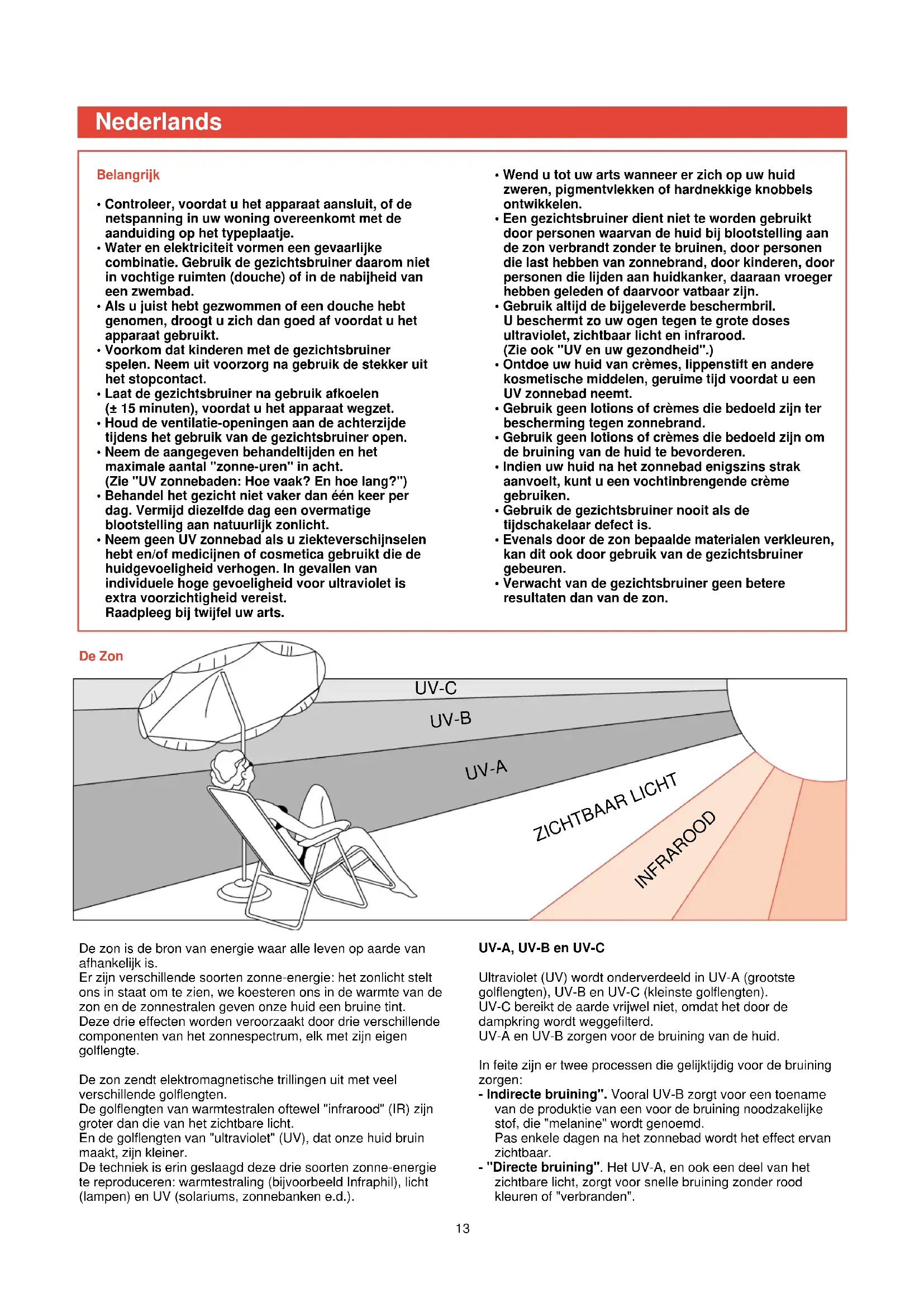 Nederlands De ZonUV zonnebaden: Hoe vaak? En hoe lang? U neemt per dag één UV zonnebad. Dit doet u gedurende 5 tot 10 dagen. Tussen de eerste twee zonnebaden neemt u een pauze van minstens 48 uur. Na zo'n kuur kunt u een rustpauze nemen. Een maand na de vorige kuur zal uw huid haar bruine tint voor een belangrijk deel weer zijn kwijtgeraakt. U kunt dan een nieuwe kuur beginnen. Het is echter ook mogelijk om na de kuur nog één of twee UV zonnebaden per week te nemen, om de bruine tint te behouden. Welke van deze beide mogelijkheden u ook kiest, zorg ervoor dat u het maximale aantal zonne-uren niet overschrijdt. Voor deze gezichtsbruiner is dat 30 uren (= 1800 minuten) per jaar. Voorbeeld: Stel dat u een UV kuur van 10 dagen volgt, met op de eerste dag een UV zonnebad van 10 minuten en op de negen daaropvolgende dagen UV zonnebaden van 25 minuten. De totale kuur omvat dan (1 x 10 minuten) + (9 x 25 minuten = ) 235 minuten. Per jaar mag u dan 7 van deze kuren volgen. (Immers: 7 x 235 minuten = 1645 minuten.) Zoals uit de tabel blijkt, geldt voor het eerste UV zonnebad van een kuur altijd een tijdsduur van 10 minuten. Dit is niet afhankelijk van de huidgevoeligheid. De gezichtsbruiner Deze gezichtsbruiner straalt voornamelijk UV-A uit, en daarnaast een heel kleine hoeveelheid UV-B. UV en uw gezondheid Na overdadige blootstelling aan ultraviolet (van de echte zon of van uw gezichtsbruiner) kan huidverbranding (zonnebrand) optreden. Naast tal van andere factoren, zoals overmatige blootstelling aan de echte zon, kan onoordeelkundig en overmatig gebruik van uw gezichtsbruiner het risico van huid- en oogaandoeningen verhogen. De aard, intensiteit en duur van de bestraling enerzijds, en de gevoeligheid van de persoon in kwestie anderzijds, zijn bepalend voor de mate waarin deze effecten kunnen optreden. Naarmate huid en ogen meer worden blootgesteld aan UV, treden hogere risico's op ten aanzien van aandoeningen als ontsteking van het hoornvlies en/of bindvlies, beschadiging van het netvlies, staarvorming, versnelde veroudering van de huid en huidtumoren. Sommige medicijnen en cosmetica verhogen de gevoeligheid voor UV. Het is daarom van groot belang, - dat u de aanwijzingen in de gedeelten "Belangrijk" en "UV zonnebaden: Hoe vaak? En: hoe lang?" opvolgt; - dat u de geadviseerde behandelafstand (=10 cm) aanhoudt; - dat u het maximale aantal zonne-uren per jaar (=30 uren of 1800 minuten) niet overschrijdt; - en dat u altijd tijdens het gebruik de bijgeleverde bescherm- bril draagt.