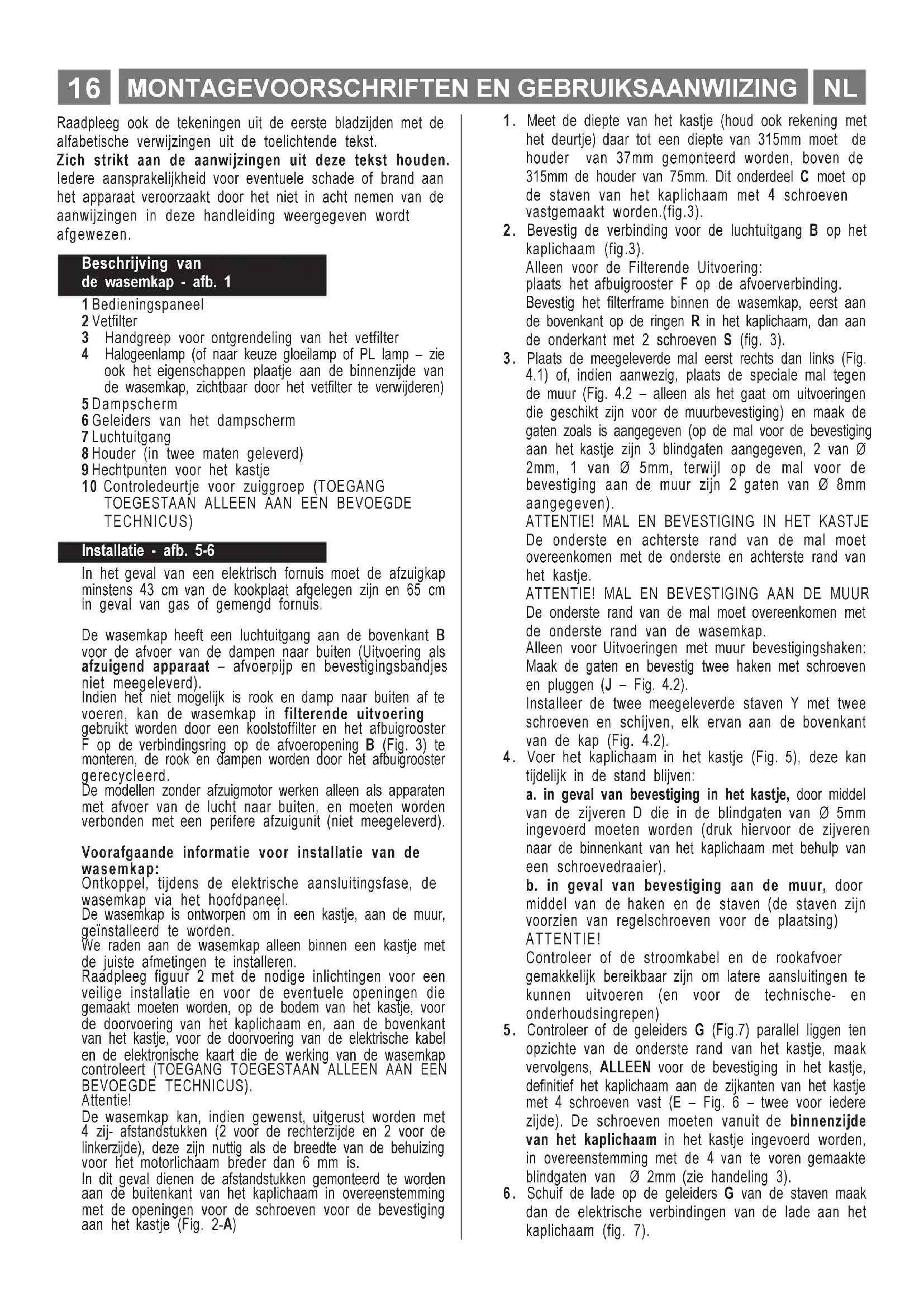 TECHNICUS) Installatie - afb. 5-6 In het geval van een elektrisch fornuis moet de afzuigkap minstens 43 cm van de kookplaat afgelegen zijn en 65 cm in geval van gas of gemengd fornuis. De wasemkap heeft een luchtuitgang aan de bovenkant B voor de afvoer van de dampen naar buiten (Uitvoering als afzuigend apparaat afvoerpijp en bevestigingsbandjes niet meegeleverd). Indien het niet mogelijk is rook en damp naar buiten af te voeren, kan de wasemkap in filterende uitvoering gebruikt worden door een koolstoffilter en het afbuigrooster F op de verbindingsring op de afvoeropening B (Fig. 3) te monteren, de rook en dampen worden door het afbuigrooster gerecycleerd. De modellen zonder afzuigmotor werken alleen als apparaten met afvoer van de lucht naar buiten, en moeten worden verbonden met een perifere afzuigunit (niet meegeleverd). Voorafgaande informatie voor installatie van de wasemkap: Ontkoppel, tijdens de elektrische aansluitingsfase, de wasemkap via het hoofdpaneel. De wasemkap is ontworpen om in een kastje, aan de muur, geïnstalleerd te worden. We raden aan de wasemkap alleen binnen een kastje met de juiste afmetingen te installeren. Raadpleeg figuur 2 met de nodige inlichtingen voor een veilige installatie en voor de eventuele openingen die gemaakt moeten worden, op de bodem van het kastje, voor de doorvoering van het kaplichaam en, aan de bovenkant van het kastje, voor de doorvoering van de elektrische kabel en de elektronische kaart die de werking van de wasemkap controleert (TOEGANG TOEGESTAAN ALLEEN AAN EEN BEVOEGDE TECHNICUS). Attentie! De wasemkap kan, indien gewenst, uitgerust worden met 4 zij- afstandstukken (2 voor de rechterzijde en 2 voor de linkerzijde), deze zijn nuttig als de breedte van de behuizing voor het motorlichaam breder dan 6 mm is. In dit geval dienen de afstandstukken gemonteerd te worden aan de buitenkant van het kaplichaam in overeenstemming met de openingen voor de schroeven voor de bevestiging aan het kastje (Fig. 2-A)