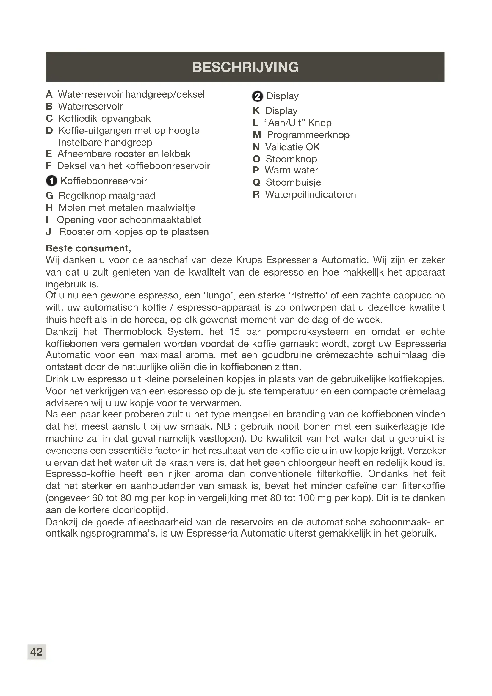 PROBLEMEN OPLOSSINGEN Het apparaat gaat niet aan na op de toets “On/Off” gedrukt te hebben. Controleer of de stekker van het netsnoer goed in het stopcontact gestoken is. Er komt op ongewone wijze water of stoom uit de stoompijpje. Bij herhaaldelijk gebruik kunnen er enkele druppels uit de stoompijpje komen. De espresso of de kofe is niet warm genoeg. Stel de temperatuur van de kofe anders in. Verwarm de kopjes door ze met warm water om te spoelen. De kofe is te licht of niet sterk genoeg. Controleer of er kofe in het bonenreservoir zit en of deze goed doorloopt. Vermijd het gebruik van vettige, gekarameliseerde of gearomatiseerde kofe. Verminder het volume van de kofe met behulp van de knop in het midden. Draai de knop voor de maalgrootte naar links voor een jner kofemaalsel. Zet de kofe in twee keer met behulp van de functie van 2 kopjes.52 PROBLEMEN OPLOSSINGEN De kofe loopt te langzaam door. Draai de knop voor de maalgrootte naar rechts voor een grover kofemaalsel (kan afhangen van de gebruikte kofesoort). Spoel het apparaat enkele keren door. De kofe is niet erg romig. Draai de knop voor de maalgrootte naar links voor een jner kofemaalsel (kan afhangen van de gebruikte kofesoort). Vervang het Claris Aqua Filter System Aqualter (volg de installatieprocedure van pagina 33). Spoel het apparaat enkele keren door. Het apparaat geeft geen kofe. Er is een incident gemeld tijdens het kofezetten. Het apparaat is automatisch gereset en is klaar voor een nieuwe cyclus. Waarom kan ik geen ontkalkingspro- gramma starten/ waarom vraagt het apparaat mij niet om een ontkal- kingsprogramma uit te voeren? Het apparaat vraagt slechts om een ontkalkingsprogramma uit te voeren nadat een zeker aantal stoomrecepten werden uitgevoerd. U heeft gemalen kofe gebruikt in plaats van kofebonen. Zuig met uw stofzuiger de voorgemalen kofe in het bonenreservoir op. De maler laat een abnormaal geluid horen. Er zitten vreemde deeltjes in de maler. Neem contact op met de Klantenservice van KRUPS. De knop voor het afstellen van de maalgrootte draait moeilijk. Wijzig de afstelling van de maler alleen wanneer deze werkt. Er komt geen stoom uit de buis. Na het apparaat uitgeschakeld en afgekoeld te hebben: Controleer of de stoombuis is aangesloten op het mondstuk. Controleer of de stoombuis niet verstopt is (indien nodig de stoombuis reinigen en ontstoppen met de meegeleverde naald). Leeg het reservoir en verwijder het Clarislter. Vul het reservoir met mineraalwater met een hoog calciumgehalte(> 100 mg/l ) en voer achter elkaar verschillende stoomcycli (5 tot 10) in een kom, totdat u een continue stoomstoot krijgt. Er is te weinig melkschuim. Ontstop, indien nodig, met de meegeleverde naald de kleine opening van de luchtinlaat aan de bovenzijde van de het stoompijpje. Gebruik een koud kannetje en melk die pas geopend is. Neem eventueel een ander soort melk (halfvolle of volle (houdbare) melk). Het melkschuim is te dik. Controleer of de 2 uiteinden van de kleine rvs buis goed in het soepele gedeelte van de stoompijpje vast zitten.53 NEDERLANDS PROBLEMEN OPLOSSINGEN Het Auto-Cappuccino accessoire zuigt de melk niet op (apart verkocht accessoire). Controleer of de buis die in de melk gedompeld wordt, niet verstopt is. Controleer of het exibele slangetje niet gedraaid is en dat het goed aansluit op het accessoire om te voorkomen dat er lucht bijkomt. Ontstop na het uitschakelen en laten afkoelen van het apparaat de uitlaatopening van het Auto-Cappuccino accessoire. Na het legen van de opvangbak voor gemalen kofe, is het waarschuwingsbericht nog steeds op het scherm weergegeven. Breng de opvangbak voor gemalen kofe opnieuw juist aan en volg de aanwijzingen op het scherm. Wacht minstens 6 seconden voordat u ze opnieuw aanbrengt. Tijdens een cyclus is er een stroomonderbreking opgetreden. Het apparaat voert automatisch een reset uit wanneer er weer stroom is en is klaar voor een nieuwe cyclus. Er ligt water of kofe onder het apparaat. De lekbak is overgelopen: maak het leeg en reinig de opvangbak voor gemalen kofe. Controleer of de lekbak goed op zijn plaats zit. Verwijder nooit het waterreservoir voordat de cyclus is beëindigd. Er verschijnt een bericht . Haal de stekker 20 seconden uit het stopcontact, verwijder in het voorkomende geval het patroon Claris en zet het apparaat weer aan. Indien het probleem blijft bestaan, noteer dan het nummer van de storing en neem contact op met de Klantendienst van KRUPS. Er loopt kofe weg achter de kofe-uitgangen. Vul het reservoir met koud water of met water op kamertemperatuur. Stel een lagere temperatuur in. Het apparaat werkt nog, maar er komt geen vloeistof uit. Controleer of het waterreservoir correct is geplaatst en of het snoer niet gekneld zit tussen de behuizing van het apparaat en het waterreservoir. Er bevindt zich kofedik in de lekbak. Dit komt voor als er kofedik naast de doorloopbak terechtkomt; zo blijft het apparaat proper. Hier volgen een aantal recepten die u kunt maken bij het gebruik van de Espresseria Automatic: Cappuccino Voor een cappuccino volgens het boekje zijn de ideale verhoudingen als volgt: 1/3 hete melk, 1/3 kofe, 1/3 opgeschuimde melk. Caffe Latte / koffie verkeerd Om kofe met veel melk te maken, ook wel caffe latte genoemd, zijn de verhoudingen als volgt: 3/5 hete melk, 1/5 kofe, 1/5 opgeschuimde melk. – Voor deze op melk gebaseerde bereidingen is het het beste om koude halfvolle melk te gebruiken die direct uit de koelkast komt (ideaal tussen 6 en 8°C).54 – Voor de ‘nishing touch’ kunt u er een beetje cacaopoeder over strooien. Café Crème Bereid een gewone espresso in een groot kopje. Voeg er een wolkje room aan toe om een ‘café crème’ te krijgen. Café corretto* Bereid een kop espresso als gewoonlijk. Voeg er dan 1/4 of 1/2 likeurglas Cognac toe om te proeven. – U kunt ook anisette, brandy, Sambuca, Kirsch of Cointreau gebruiken. Er zijn vele manieren om uw espresso kracht bij te zetten. Gebruik gewoon uw fantasie. Koffielikeur* Mix