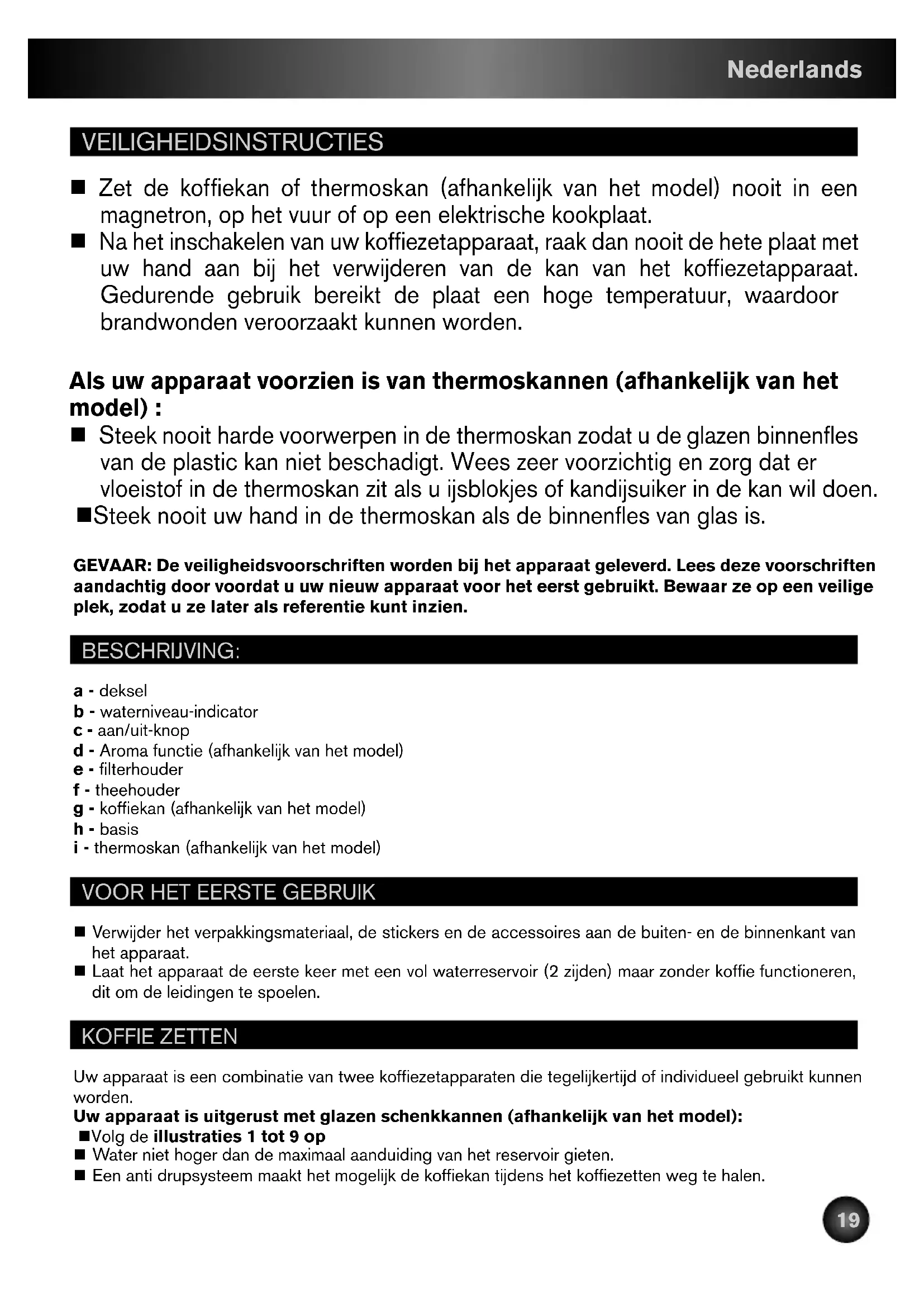 VEILIGHEIDSINSTRUCTIES n Zet de koffiekan of thermoskan (afhankelijk van het model) nooit in een magnetron, op het vuur of op een elektrische kookplaat. n Na het inschakelen van uw koffiezetapparaat, raak dan nooit de hete plaat met uw hand aan bij het verwijderen van de kan van het koffiezetapparaat. Gedurende gebruik bereikt de plaat een hoge temperatuur, waardoor brandwonden veroorzaakt kunnen worden. Als uw apparaat voorzien is van thermoskannen (afhankelijk van het model) : n Steek nooit harde voorwerpen in de thermoskan zodat u de glazen binnenfles van de plastic kan niet beschadigt. Wees zeer voorzichtig en zorg dat er vloeistof in de thermoskan zit als u ijsblokjes of kandijsuiker in de kan wil doen. n Steek nooit uw hand in de thermoskan als de binnenfles van glas is. GEVAAR: De veiligheidsvoorschriften worden bij het apparaat geleverd. Lees deze voorschriften aandachtig door voordat u uw nieuw apparaat voor het eerst gebruikt. Bewaar ze op een veilige plek, zodat u ze later als referentie kunt inzien. BESCHRIJVING: a - deksel b - waterniveau-indicator c - aan/uit-knop d - Aroma functie (afhankelijk van het model) e - filterhouder f - theehouder g - koffiekan (afhankelijk van het model) h - basis i - thermoskan (afhankelijk van het model)