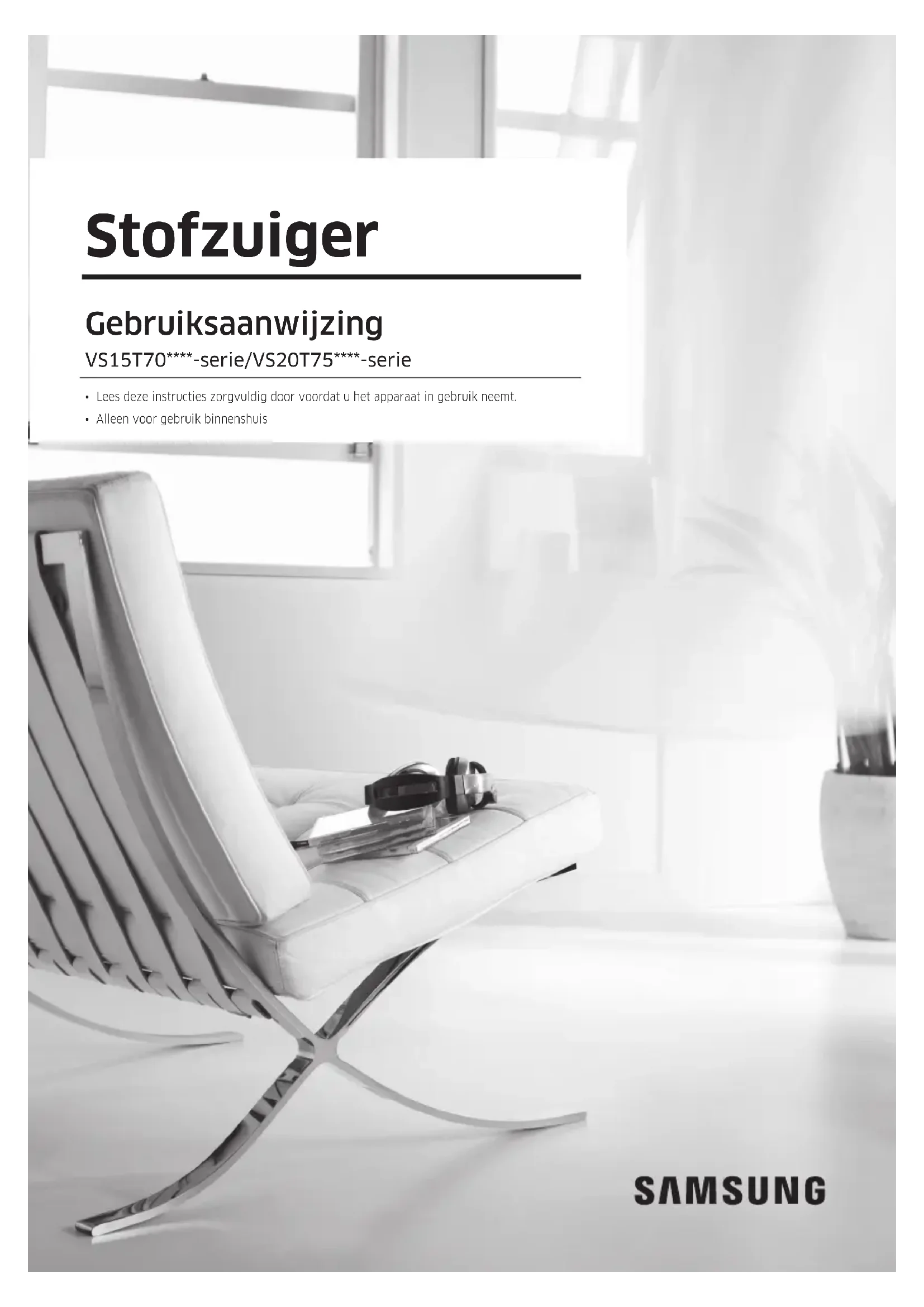 - Alleen voor gebruik binnenshuis 2_VS7000_NL_00837B-01_EN.indd 1 2020-04-26 오후 11:12:08Inhoud VOORBEREIDING Veiligheidsinformatie 3 INSTALLATIE Namen van de onderdelen 13 Accessoires 14 De wandbevestiging installeren 15 De wandbevestiging in elkaar zetten 15 De wandbevestiging installeren 15 BEDIENING De stofzuiger gebruiken 16 De wandbevestiging gebruiken 16 De batterij opladen 17 De stofzuiger bedienen 18 De accessoires gebruiken 19 ONDERHOUD Onderhoud van de stofzuiger 22 Wanneer u de stofopvangbak moet legen 22 Het legen van de stofopvangbak zonder stofwolken te veroorzaken 22 De stofopvangbak legen en schoonmaken 22 Het lter schoonmaken 24 De accessoires schoonmaken 24 BIJLAGE Opmerkingen en waarschuwingen 26 Batterijgebruik 26 Bediening 27 Onderhoud 29 Problemen oplossen 30 Productspecicatie Model VS20T75**** VS15T70**** Aan-uit 100-240 V
