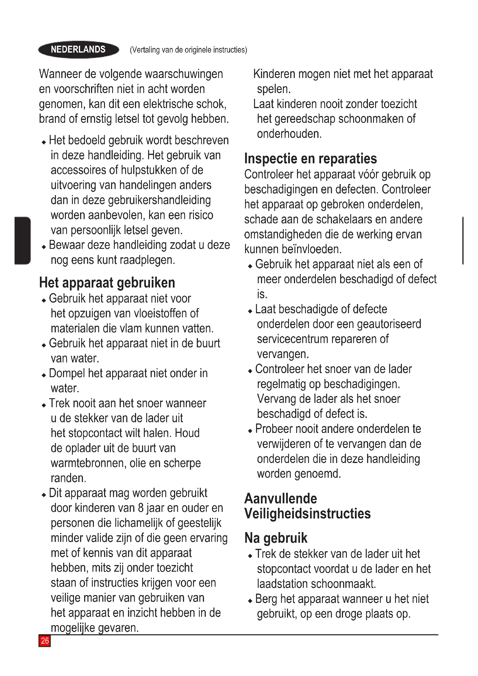 Waarschuwing! Lees alle veiligheidswaarschuwingen en alle instructies.26 (Vertaling van de originele instructies) NEDERLANDS Wanneer de volgende waarschuwingen en voorschriften niet in acht worden genomen, kan dit een elektrische schok, brand of ernstig letsel tot gevolg hebben. u Het bedoeld gebruik wordt beschreven in deze handleiding. Het gebruik van accessoires of hulpstukken of de uitvoering van handelingen anders dan in deze gebruikershandleiding worden aanbevolen, kan een risico van persoonlijk letsel geven. u Bewaar deze handleiding zodat u deze nog eens kunt raadplegen. Het apparaat gebruiken u Gebruik het apparaat niet voor het opzuigen van vloeistoffen of materialen die vlam kunnen vatten. u Gebruik het apparaat niet in de buurt van water. u Dompel het apparaat niet onder in water. u Trek nooit aan het snoer wanneer u de stekker van de lader uit het stopcontact wilt halen. Houd de oplader uit de buurt van warmtebronnen, olie en scherpe randen. u Dit apparaat mag worden gebruikt door kinderen van 8 jaar en ouder en personen die lichamelijk of geestelijk minder valide zijn of die geen ervaring met of kennis van dit apparaat hebben, mits zij onder toezicht staan of instructies krijgen voor een veilige manier van gebruiken van het apparaat en inzicht hebben in de mogelijke gevaren. Kinderen mogen niet met het apparaat spelen. Laat kinderen nooit zonder toezicht het gereedschap schoonmaken of onderhouden. Inspectie en reparaties Controleer het apparaat vóór gebruik op beschadigingen en defecten. Controleer het apparaat op gebroken onderdelen, schade aan de schakelaars en andere omstandigheden die de werking ervan kunnen beïnvloeden. u Gebruik het apparaat niet als een of meer onderdelen beschadigd of defect is. u Laat beschadigde of defecte onderdelen door een geautoriseerd servicecentrum repareren of vervangen. u Controleer het snoer van de lader regelmatig op beschadigingen. Vervang de lader als het snoer beschadigd of defect is. u Probeer nooit andere onderdelen te verwijderen of te vervangen dan de onderdelen die in deze handleiding worden genoemd. Aanvullende Veiligheidsinstructies Na gebruik u Trek de stekker van de lader uit het stopcontact voordat u de lader en het laadstation schoonmaakt. u Berg het apparaat wanneer u het niet gebruikt, op een droge plaats op.27 (Vertaling van de originele instructies)NEDERLANDSu Houd apparaten buiten het bereik van kinderen, ook wanneer ze zijn opgeborgen. Overige risico’s Er kunnen zich bij het gebruik van dit gereedschap nog meer risico’s voordoen, die mogelijk niet in de bijgesloten veiligheidswaarschuwingen worden beschreven. Deze risico’s kunnen zich voordoen door onoordeelkundig gebruik, langdurig gebruik, enz. Zelfs wanneer de veiligheidsvoorschriften in acht worden genomen en de veiligheidsvoorzieningen worden gebruikt, kunnen bepaalde risico’s niet worden uitgesloten. Dit zijn onder meer: u Verwondingen die worden veroorzaakt door het aanraken van draaiende of bewegende onderdelen. u Verwondingen die worden veroorzaakt bij het vervangen van onderdelen, messen of accessoires. u Verwondingen die worden veroorzaakt door langdurig gebruik van gereedschap. Wanneer u langere periodes met gereedschap werkt, kunt u het beste regelmatig een pauze nemen. u Gehoorbeschadiging.u Gezondheidsrisico’s door het inademen van stof dat vrijkomt tijdens het gebruik van uw gereedschap (bijvoorbeeld: het werken met hout, met name eiken, beuken en MDF). Laders De lader is ontworpen voor een bepaalde spanning. Controleer altijd dat de netspanning overeenkomt met de waarde op het typeplaatje. Waarschuwing! Probeer nooit de lader te voorzien van een normale netstekker. u Gebruik de lader van BLACK+DECKER alleen voor de accu’s in het apparaat waarbij de lader is geleverd. Andere batterijen kunnen openbarsten, met persoonlijk letsel en materiële schade tot gevolg. u Niet-oplaadbare accu’s mogen nooit worden opgeladen. u Als het netsnoer is beschadigd, moet het door de fabrikant of door een geautoriseerd BLACK+DECKER- servicecentrum worden vervangen, zodat gevaarlijke situaties worden voorkomen. u Stel de lader niet bloot aan water.u Maak de lader niet open.u Steek niet met een scherp voorwerp in de lader. u Plaatshetapparaat/deaccutijdens het laden op een goed geventileerde locatie. Elektrische veiligheid Symbolen op de lader