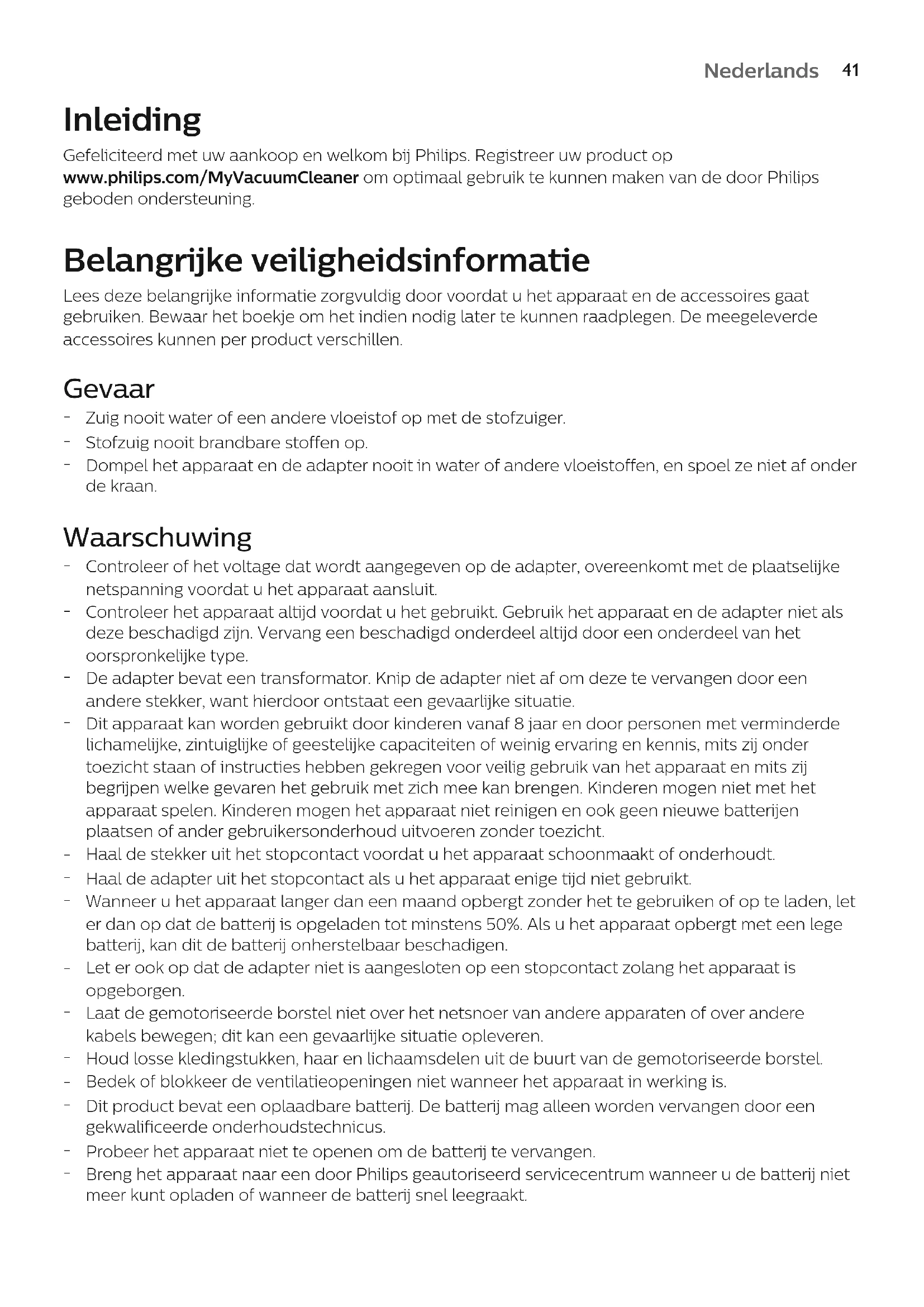 Nederlands Inleiding Gefeliciteerd met uw aankoop en welkom bij Philips. Registreer uw product op www.philips.com/MyVacuumCleaner om optimaal gebruik te kunnen maken van de door Philips geboden ondersteuning. Belangrijke veiligheidsinformatie Lees deze belangrijke informatie zorgvuldig door voordat u het apparaat en de accessoires gaat gebruiken. Bewaar het boekje om het indien nodig later te kunnen raadplegen. De meegeleverde accessoires kunnen per product verschillen. Gevaar