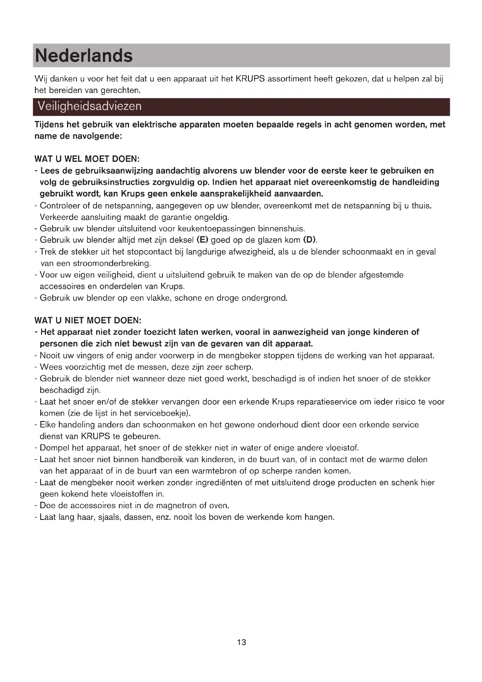 1 or 2 3 or 4 5 s Vari-Pulse 30 s Vari-Pulse Vari-Pulse Cleaning What to do if your blender does not work Recycling Environment protection first ! Your appliance contains valuable materials which can be recovered or recycled. Leave it at a local civic waste collection point. notice* 6/04/06 14:27 Page 1213 Nederlands Wij danken u voor het feit dat u een apparaat uit het KRUPS assortiment heeft gekozen, dat u helpen zal bij het bereiden van gerechten. Tijdens het gebruik van elektrische apparaten moeten bepaalde regels in acht genomen worden, met name de navolgende: WAT U WEL MOET DOEN: - Lees de gebruiksaanwijzing aandachtig alvorens uw blender voor de eerste keer te gebruiken en volg de gebruiksinstructies zorgvuldig op. Indien het apparaat niet overeenkomstig de handleiding gebruikt wordt, kan Krups geen enkele aansprakelijkheid aanvaarden. - Controleer of de netspanning, aangegeven op uw blender, overeenkomt met de netspanning bij u thuis. Verkeerde aansluiting maakt de garantie ongeldig. - Gebruik uw blender uitsluitend voor keukentoepassingen binnenshuis. - Gebruik uw blender altijd met zijn deksel (E) goed op de glazen kom (D). - Trek de stekker uit het stopcontact bij langdurige afwezigheid, als u de blender schoonmaakt en in geval van een stroomonderbreking. - Voor uw eigen veiligheid, dient u uitsluitend gebruik te maken van de op de blender afgestemde accessoires en onderdelen van Krups. - Gebruik uw blender op een vlakke, schone en droge ondergrond. WAT U NIET MOET DOEN: - Het apparaat niet zonder toezicht laten werken, vooral in aanwezigheid van jonge kinderen of personen die zich niet bewust zijn van de gevaren van dit apparaat. - Nooit uw vingers of enig ander voorwerp in de mengbeker stoppen tijdens de werking van het apparaat. - Wees voorzichtig met de messen, deze zijn zeer scherp. - Gebruik de blender niet wanneer deze niet goed werkt, beschadigd is of indien het snoer of de stekker beschadigd zijn. - Laat het snoer en/of de stekker vervangen door een erkende Krups reparatieservice om ieder risico te voor komen (zie de lijst in het serviceboekje). - Elke handeling anders dan schoonmaken en het gewone onderhoud dient door een erkende service dienst van KRUPS te gebeuren. - Dompel het apparaat, het snoer of de stekker niet in water of enige andere vloeistof. - Laat het snoer niet binnen handbereik van kinderen, in de buurt van, of in contact met de warme delen van het apparaat of in de buurt van een warmtebron of op scherpe randen komen. - Laat de mengbeker nooit werken zonder ingrediënten of met uitsluitend droge producten en schenk hier geen kokend hete vloeistoffen in. - Doe de accessoires niet in de magnetron of oven. - Laat lang haar, sjaals, dassen, enz. nooit los boven de werkende kom hangen. Veiligheidsadviezen notice* 6/04/06 14:27 Page 1314 Beschrijving van de blender A Metalen voetstuk B Bedieningspaneel snelheden b1 – uitknop b2 – snelheid Slow (langzaam) b3 – snelheid 1 b4 – snelheid 2 b5 – snelheid 3 b6 – snelheid 4 b7 – functie Ice Cruch (gemalen ijs) b8 – functie Vari-Pulse C Ruimte voor het opbergen van het snoer D Mengbeker d1Vergrendelingsring d2 Afneembaar mes d3 Rubberring d4 Glazen kom met maatverdeling van 1,75 L E Deksel van de mengbeker F Doseerdop van 75 ml G Hakmolen-accessoire (afhankelijk van het model) Belangrijk: Controleer of het deksel van de mengbeker (E), voorzien van de doseerdop (F), goed op de blender (D) zit. - Het apparaat nooit gelijk aanzetten op de hoogste snelheid. - De snelheid geleidelijk opbouwen. - Verwijder de mengbeker of het accessoire pas nadat het apparaat volledig tot stilstand is gekomen. Voor een aangenamer gebruik of voor het opbergen kunt u de lengte van het snoer inkorten door dit in het metalen voetstuk (A) te duwen via de opening aan de achterkant (C) (schema 1). - Maak voor de eerste ingebruikname de mengbeker, het deksel, de doseerdop en het accessoire schoon met lauw zeepwater. Zorgvuldig afspoelen en afdrogen.