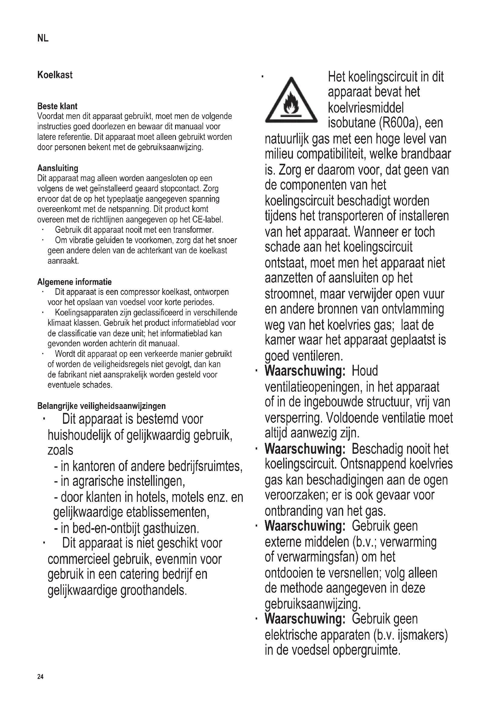 Het koelingscircuit in dit apparaat bevat het koelvriesmiddel isobutane (R600a), een natuurlijk gas met een hoge level van milieu compatibiliteit, welke brandbaar is. Zorg er daarom voor, dat geen van de componenten van het koelingscircuit beschadigt worden tijdens het transporteren of installeren van het apparaat. Wanneer er toch schade aan het koelingscircuit ontstaat, moet men het apparaat niet aanzetten of aansluiten op het stroomnet, maar verwijder open vuur en andere bronnen van ontvlamming weg van het koelvries gas; laat de kamer waar het apparaat geplaatst is goed ventileren. ∙ Waarschuwing: Houd ventilatieopeningen, in het apparaat of in de ingebouwde structuur, vrij van versperring. Voldoende ventilatie moet altijd aanwezig zijn. ∙ Waarschuwing: Beschadig nooit het koelingscircuit. Ontsnappend koelvries gas kan beschadigingen aan de ogen veroorzaken; er is ook gevaar voor ontbranding van het gas. ∙ Waarschuwing: Gebruik geen externe middelen (b.v.; verwarming of verwarmingsfan) om het ontdooien te versnellen; volg alleen de methode aangegeven in deze gebruiksaanwijzing. ∙ Waarschuwing: Gebruik geen elektrische apparaten (b.v. ijsmakers) in de voedsel opbergruimte. NL25 142 x 208 mm ∙ Voordat men het apparaat aansluit op het stroomnet, moet de unit eerst goed gecontroleerd worden op beschadigingen, snoer inbegrepen. In het geval dat men zulke schade vindt, moet men het apparaat niet op het stroomnet aansluiten. ∙ Bij het opzetten van het apparaat is ervoor zorg te dragen, dat het netaansluitingssnoer niet wordt ingeklemd of beschadigt. ∙ Portable meervoudige stekkerdozen of netvoedingen mogen niet aan de achterkant van het apparaat worden geplaatst. ∙ Dit apparaat is niet ontworpen voor het opbergen van explosieve materialen zoals spuitbussen met een brandbaar drijfgas. ∙ Wanneer het apparaat verkocht word, en overgegeven wordt aan een derde of wanneer men het apparaat weggooit in een daarvoor geschikte recycle faciliteit, attentie moet gegeven worden aan de aanwezigheid van de isolatie agent ‘cyclopenthane’ en tevens het koelvriesmiddel R600a. Voor aanvullende informatie over de juiste wijze van recyclen paragraaf Weggooien raadplegen. ∙ Om te voldoen aan alle veiligheidsvoorschriften en om gevaar te voorkomen, reparaties en modicaties aan dit apparaat mogen alleen uitgevoert worden door gemachtigd service personeel, vervangen van snoer inbegrepen. ∙ Dit apparaat mag gebruikt worden door kinderen (tenminste 8 jaar oud) en door personen met verminderde fysische, zintuiglijke of mentale bekwaamheden, of gebrek van ervaring en kennis, wanneer deze onder begeleiding zijn of instructies ontvangen hebben over het gebruik van dit apparaat en volledig de gevaren en veiligheidsvoorschriften begrijpen. ∙ Kinderen tussen 3 en 8 jaar mogen het koel-/ vriesapparaat laden en lossen. ∙ Kinderen mogen niet met het apparaat spelen. ∙ Kinderen mogen niet worden toegestaan om schoonmaak of onderhoud werk aan deze apparaten te doen tenzij onder begeleiding. ∙ Voor regelmatig schoonmaken bevelen wij aan dat men warm water met wat zachte zeep gebruikt. Voor uitvoerige informatie over het schoonmaken van het apparaat, raadpleeg de sectie Ontdooien en schoonmaken. Om de vervuiling van levensmiddelen te vermijden, zijn de volgende aanwijzingen na te komen: ∙ Als de deur voor een langer tijd wordt geopend, kan het tot een aanmerkelijke temperatuurstijging in de vakken van het apparaat komen. ∙ De vlakken, die met levensmiddelen en toegankelijke aoopsystemen in aanraking komen, moeten regelmatig worden gezuiverd. ∙ Bewaar rauw vlees en vis in geschikte26 142 x 208 mm verpakkingen in de koelkast, zodat het andere levensmiddelen niet raakt of op deze druipt. ∙ Als het koel-/ vriesapparaat voor een langere tijd leeg staat, het apparaat afzetten, ontdooien, reinigen en de deur openlaten om schimmelvorming te vermijden. Bewaren van voedsel ∙ De temperatuur in de koelkast en het koud opslag compartiment hangen grotendeels af van de omgevende temperatuur, the temperatuurcontrole zetting en de hoeveelheid op te bergen voedsel. Koud opslag compartiment: ∙ Het koud-opslag compartiment is speciaal omtworpen voor het opslaan voor korte termijn van vers vlees, vis of gevogelte. Koelkast ∙ Verschillende gedeeltes van de koelkast worden op een verschillende manier beïnvloed door een koelingseffect. Het warmste gedeelte is rond de deur in het bovenste gedeelte van de koelkast, het koudste gedeelte is rond de achtermuur en in het onderste gedeelte van de koelkast. ∙ Het voedsel moet daarom als volgt opgeborgen worden: ∙ Op de hoofdplanken van de koelkast (van boven naar beneden): bakkerij items, kant en klare maaltijden, melk producten, vlees, vis en cold-cuts/ worstjes. ∙ In de deur (van boven naar beneden): boter, kaas, eieren, tubes (b.v. mosterd), kleine essen, grote essen, melk en vruchtensap tetra-pakken. ∙ Om gevaar van persoonlijke ongelukken te voorkomen of schade aan het apparaat, mag dit apparaat alleen vervoert worden in de originele verpakking. ∙ Waarschuwing: Houdt kinderen weg van inpakmateriaal, daar deze een bron van gevaar zijn b.v. door verstikking. ∙ Het ijs wat men verwijdert tijdens het ontdooien is niet geschikt voor menselijke consumptie. ∙ Het snoer moet regelmatig op eventuele beschadiging worden gecontroleerd. Wanneer een beschadiging wordt geconstateerd mag het apparaat niet meer worden gebruikt. ∙ Om gevaar van brand te voorkomen, plaats geen thermo-elektrische apparaten boven op de apparaat. Plaats nooit containers met vloeistoffen op de unit: dit om voorkomen dat lekken of ontsnappen van vloeistoffen de elektrische isolatie beschadigd. ∙ Deze unit is alleen ontworpen voor het opbergen van voedsel. ∙ Alcoholische dranken mogen alleen opgeborgen worden in gesloten containers en in rechtopstaande positie. ∙ Plaats geen glazen essen met carbonaat houdende of andere te vriezen vloeistoffen in de unit: zulke essen kunnen barst