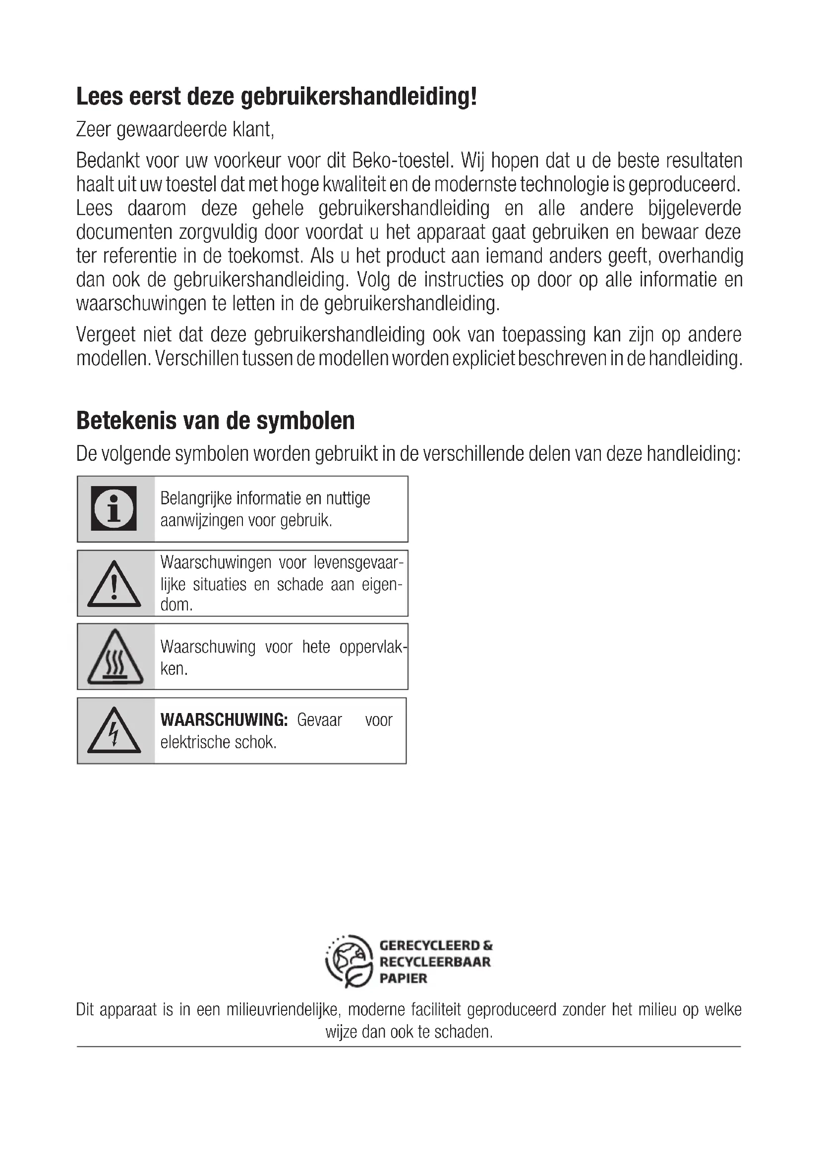 Waarschuwingen voor levensgevaar- lijke situaties en schade aan eigen- dom. Waarschuwing voor hete oppervlak- ken.