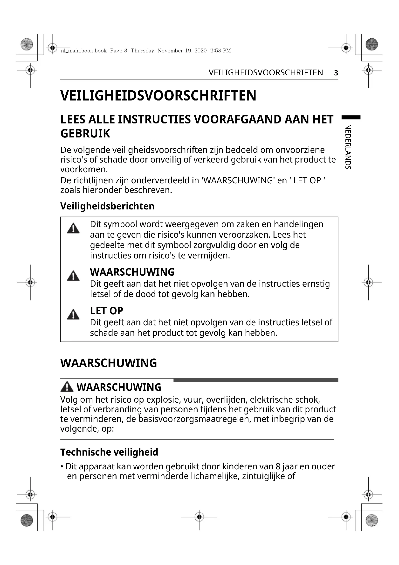 - Dit apparaat kan worden gebruikt door kinderen van 8 jaar en ouder en personen met verminderde lichamelijke, zintuiglijke of Dit symbool wordt weergegeven om zaken en handelingen aan te geven die risico's kunnen veroorzaken. Lees het gedeelte met dit symbool zorgvuldig door en volg de instructies om risico's te vermijden. WAARSCHUWING Dit geeft aan dat het niet opvolgen van de instructies ernstig letsel of de dood tot gevolg kan hebben. LET OP Dit geeft aan dat het niet opvolgen van de instructies letsel of schade aan het product tot gevolg kan hebben. nl_main.book.book Page 3 Thursday, November 19, 2020 2:58 PM4 VEILIGHEIDSVOORSCHRIFTEN verstandelijke vermogens of gebrek aan ervaring en kennis, als ze onder toezicht staan of worden geïnstrueerd over het veilig gebruik van het apparaat en bijbehorende gevaren begrijpen. Kinderen mogen niet met het apparaat spelen. Reiniging en onderhoud door de gebruiker mogen niet worden uitgevoerd door kinderen zonder toezicht.