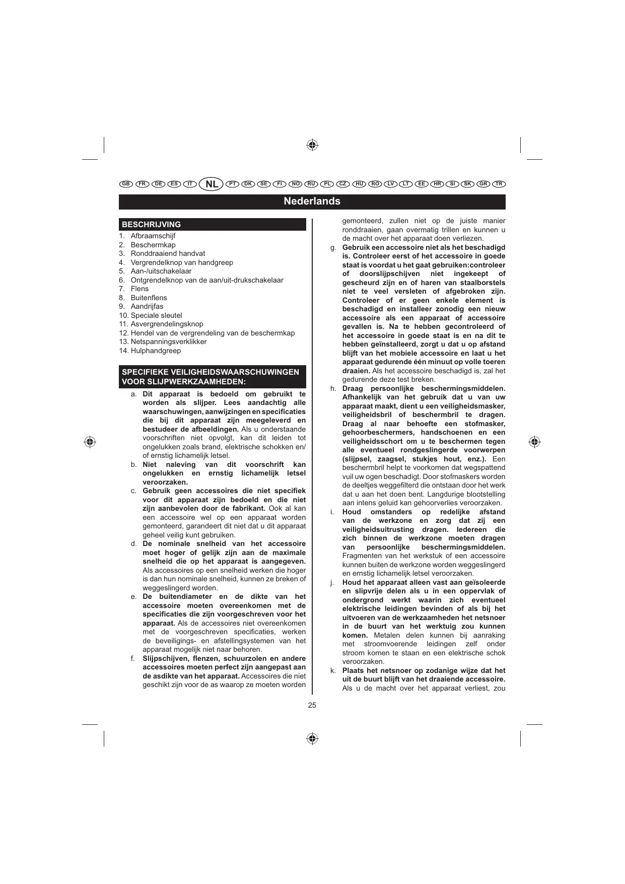 j. Zorg dat de vonken die tijdens het gebruik van uw slijper ontstaan geen enkel gelevar kunden opleveren en dat ze bijvoorbeeld Niet maar personen of ontvlambare stoffen worden wegspatten.