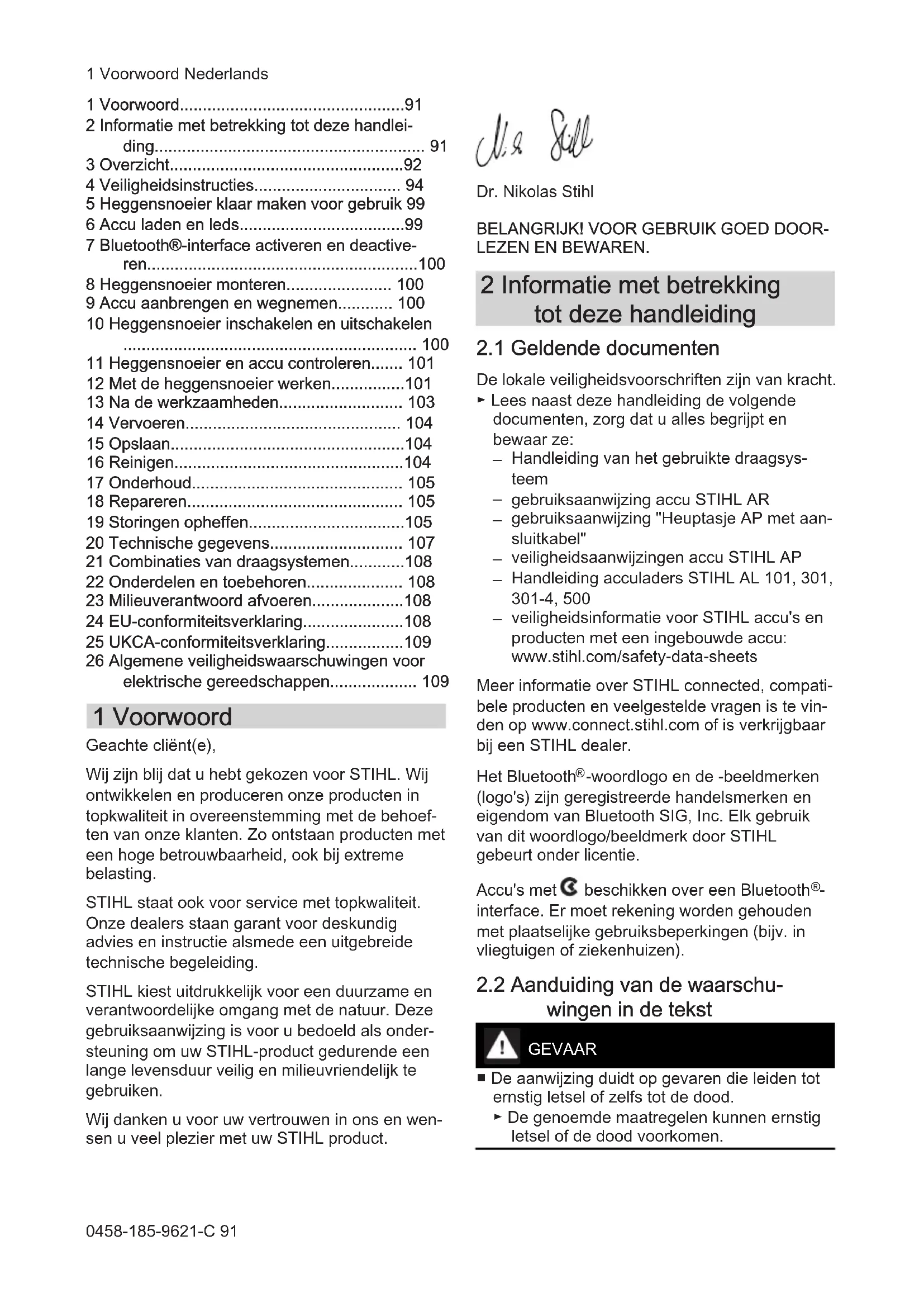 - 26 Algemene veiligheidswaarschuwingen voor elektrische gereedschappen 1 Voorwoord Geachte cliënt(e), Wij zijn blij dat u hebt gekozen voor STIHL. Wij ontwikkelen en produceren onze producten in topkwaliteit in overeenstemming met de behoef‐ ten van onze klanten. Zo ontstaan producten met een hoge betrouwbaarheid, ook bij extreme belasting. STIHL staat ook voor service met topkwaliteit. Onze dealers staan garant voor deskundig advies en instructie alsmede een uitgebreide technische begeleiding. STIHL kiest uitdrukkelijk voor een duurzame en verantwoordelijke omgang met de natuur. Deze gebruiksaanwijzing is voor u bedoeld als onder‐ steuning om uw STIHL-product gedurende een lange levensduur veilig en milieuvriendelijk te gebruiken. Wij danken u voor uw vertrouwen in ons en wen‐ sen u veel plezier met uw STIHL product. Dr. Nikolas Stihl p. 109