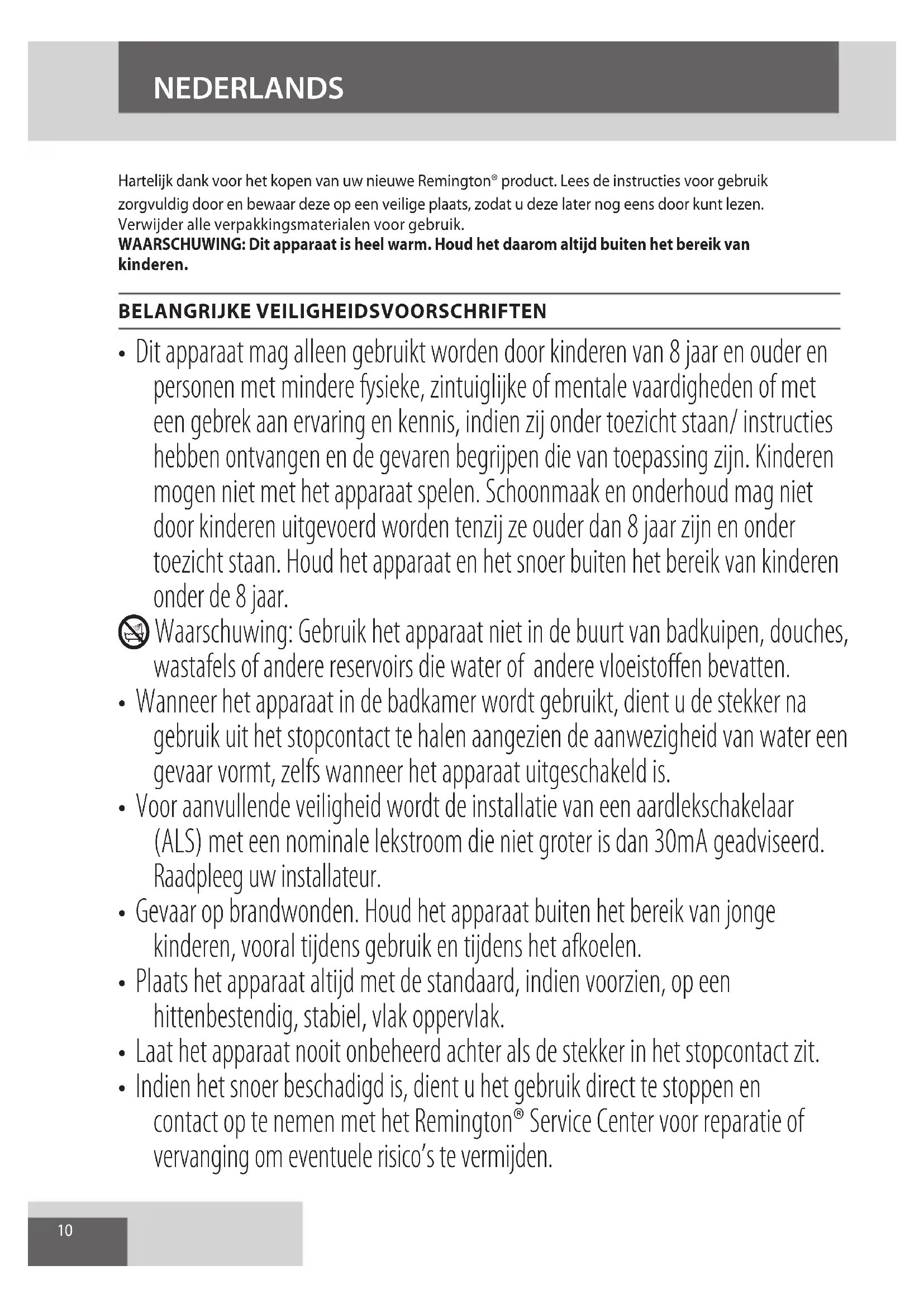 - Indien het snoer beschadigd is, dient u het gebruik direct te stoppen en contact op te nemen met het Remington® Service Center voor reparatie of vervanging om eventuele risico’s te vermijden. NEDERLANDS11 NEDERLANDS