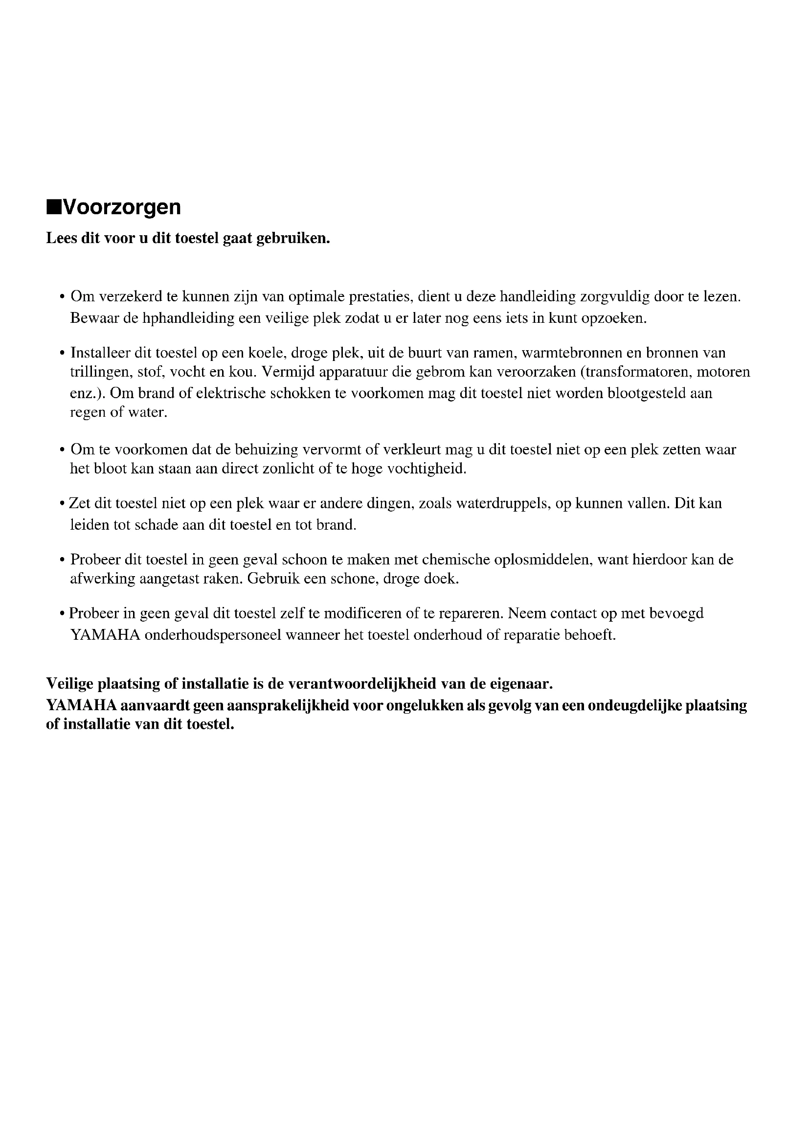 - Installeer dit toestel op een koele, droge plek, uit de buurt van ramen, warmtebronnen en bronnen van trillingen, stof, vocht en kou. Vermijd apparatuur die gebrom kan veroorzaken (transformatoren, motoren enz.). Om brand of elektrische schokken te voorkomen mag dit toestel niet worden blootgesteld aan regen of water.