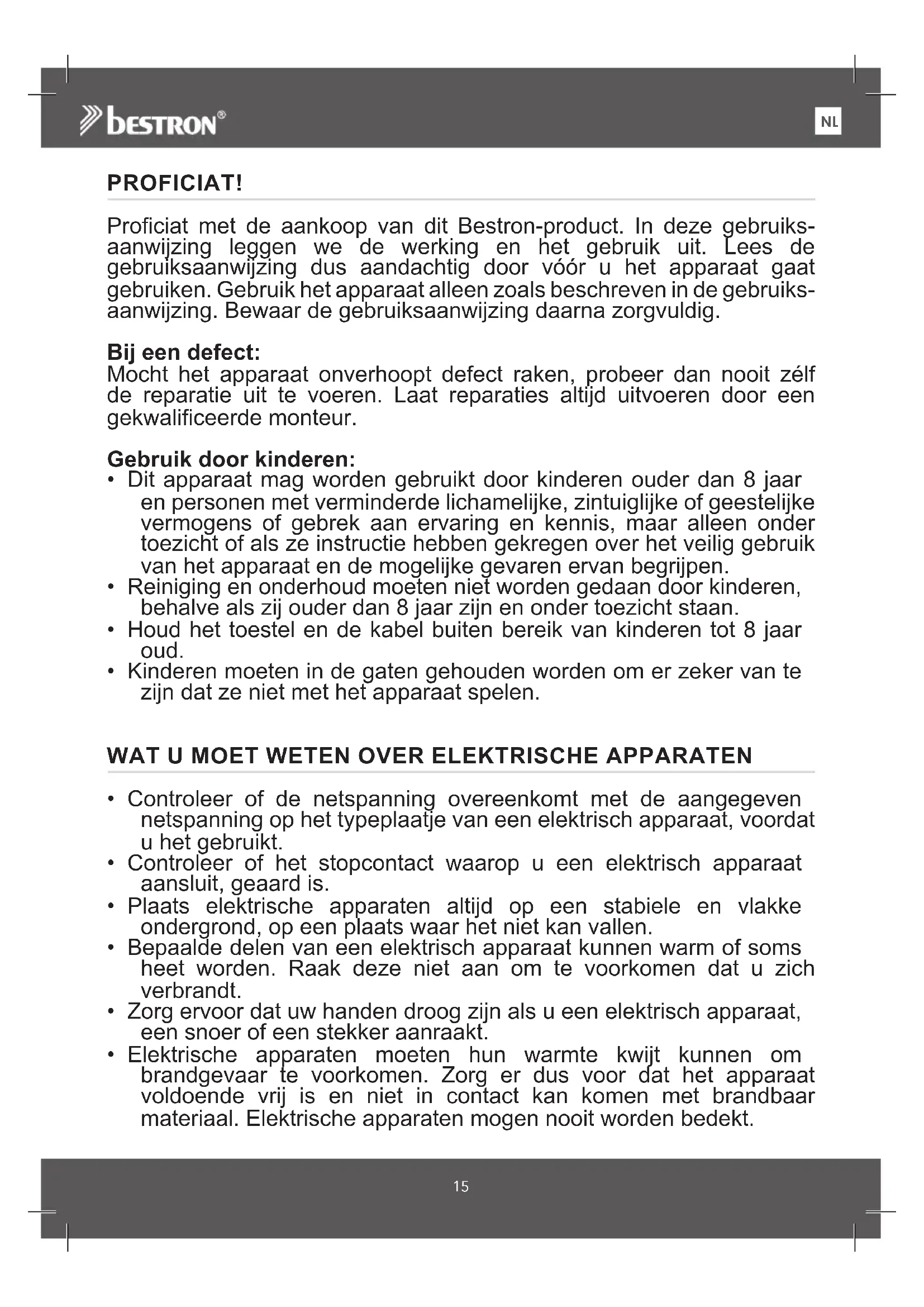 PROFICIAT! Proficiat met de aankoop van dit Bestron-product. In deze gebruiks- aanwijzing leggen we de werking en het gebruik uit. Lees de gebruiksaanwijzing dus aandachtig door vóór u het apparaat gaat gebruiken. Gebruik het apparaat alleen zoals beschreven in de gebruiks- aanwijzing. Bewaar de gebruiksaanwijzing daarna zorgvuldig. Bij een defect: Mocht het apparaat onverhoopt defect raken, probeer dan nooit zélf de reparatie uit te voeren. Laat reparaties altijd uitvoeren door een gekwalificeerde monteur. Gebruik door kinderen: