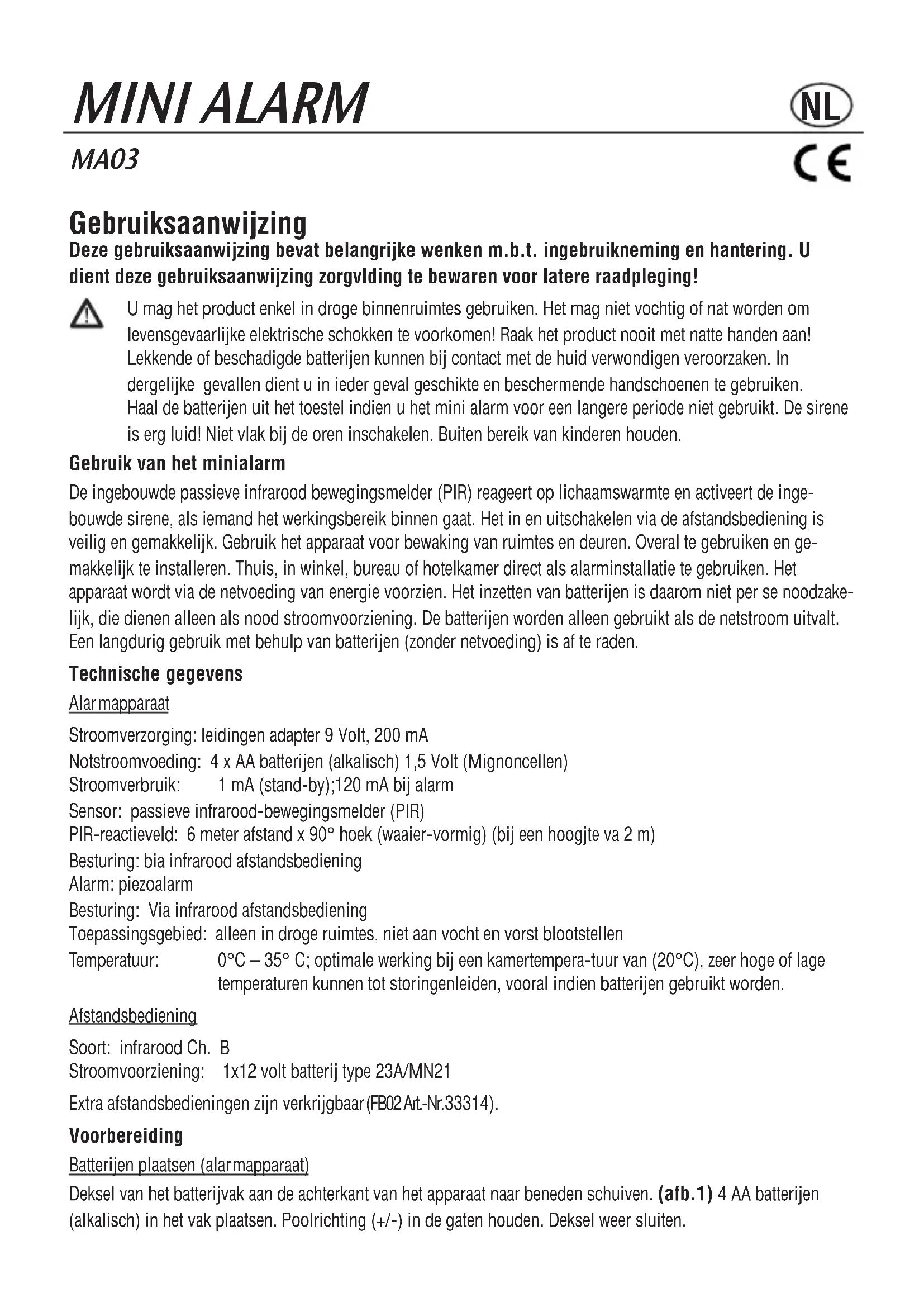 piepst 2xGebruiksaanwijzing Deze gebruiksaanwijzing bevat belangrijke wenken m.b.t. ingebruikneming en hantering. U dient deze gebruiksaanwijzing zorgvlding te bewaren voor latere raadpleging! U mag het product enkel in droge binnenruimtes gebruiken. Het mag niet vochtig of nat worden om levensgevaarlijke elektrische schokken te voorkomen! Raak het product nooit met natte handen aan! Lekkende of beschadigde batterijen kunnen bij contact met de huid verwondigen veroorzaken. In dergelijke gevallen dient u in ieder geval geschikte en beschermende handschoenen te gebruiken. Haal de batterijen uit het toestel indien u het mini alarm voor een langere periode niet gebruikt. De sirene is erg luid! Niet vlak bij de oren inschakelen. Buiten bereik van kinderen houden. Gebruik van het minialarm De ingebouwde passieve infrarood bewegingsmelder (PIR) reageert op lichaamswarmte en activeert de inge- bouwde sirene, als iemand het werkingsbereik binnen gaat. Het in en uitschakelen via de afstandsbediening is veilig en gemakkelijk. Gebruik het apparaat voor bewaking van ruimtes en deuren. Overal te gebruiken en ge- makkelijk te installeren. Thuis, in winkel, bureau of hotelkamer direct als alarminstallatie te gebruiken. Het apparaat wordt via de netvoeding van energie voorzien. Het inzetten van batterijen is daarom niet per se noodzake- lijk, die dienen alleen als nood stroomvoorziening. De batterijen worden alleen gebruikt als de netstroom uitvalt. Een langdurig gebruik met behulp van batterijen (zonder netvoeding) is af te raden. Technische gegevens Alar mapparaat Stroomverzorging: leidingen adapter 9 Volt, 200 mA Notstroomvoeding: 4 x AA batterijen (alkalisch) 1,5 Volt (Mignoncellen) Stroomverbruik: 1 mA (stand-by);120 mA bij alarm Sensor: passieve infrarood-bewegingsmelder (PIR) PIR-reactieveld: 6 meter afstand x 90° hoek (waaier-vormig) (bij een hoogjte va 2 m) Besturing: bia infrarood afstandsbediening Alarm: piezoalarm Besturing: Via infrarood afstandsbediening Toepassingsgebied: alleen in droge ruimtes, niet aan vocht en vorst blootstellen Temperatuur: 0°C – 35° C; optimale werking bij een kamertempera-tuur van (20°C), zeer hoge of lage temperaturen kunnen tot storingenleiden, vooral indien batterijen gebruikt worden. Afstandsbediening Soort: infrarood Ch. B Stroomvoorziening: 1x12 volt batterij type 23A/MN21 Extra afstandsbedieningen zijn verkrijgbaar (FB02 Art.-Nr.33314). Voorbereiding Batterijen plaatsen (alar mapparaat) Deksel van het batterijvak aan de achterkant van het apparaat naar beneden schuiven. (afb.1) 4 AA batterijen (alkalisch) in het vak plaatsen. Poolrichting (+/-) in de gaten houden. Deksel weer sluiten.