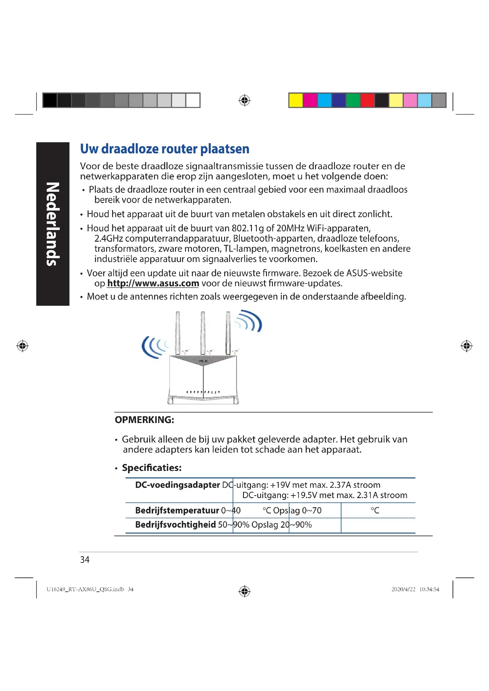 - Voer altijd een update uit naar de nieuwste rmware. Bezoek de ASUS-website op http://www.asus.com voor de nieuwst rmware-updates.