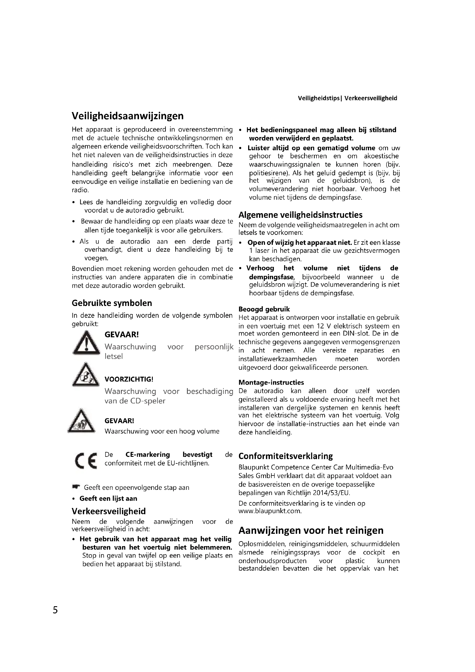 - Open of wijzig het apparaat niet. Er zit een klasse 1 laser in het apparaat die uw gezichtsvermogen kan beschadigen. • Verhoog het volume niet tijdens de dempingsfase, bijvoorbeeld wanneer u de geluidsbron wijzigt. De volumeverandering is niet hoorbaar tijdens de dempingsfase. Beoogd gebruik Het apparaat is ontworpen voor installatie en gebruik in een voertuig met een 12 V elektrisch systeem en moet worden gemonteerd in een DIN-slot. De in de technische gegevens aangegeven vermogensgrenzen in acht nemen. Alle vereiste reparaties en installatiewerkzaamheden moeten worden uitgevoerd door gekwalificeerde personen. Montage-instructies De autoradio kan alleen door uzelf worden geïnstalleerd als u voldoende ervaring heeft met het installeren van dergelijke systemen en kennis heeft van het elektrische systeem van het voertuig. Volg hiervoor de installatie-instructies aan het einde van deze handleiding. Conformiteitsverklaring Blaupunkt Competence Center Car Multimedia-Evo Sales GmbH verklaart dat dit apparaat voldoet aan de basisvereisten en de overige toepasselijke bepalingen van Richtlijn 2014/53/EU. De conformiteitsverklaring is te vinden op www.blaupunkt.com. Aanwijzingen voor het reinigen Oplosmiddelen, reinigingsmiddelen, schuurmiddelen alsmede reinigingssprays voor de cockpit en onderhoudsproducten voor plastic kunnen bestanddelen bevatten die het oppervlak van het 5Conformiteitsverklaring | Opmerkingen over reiniging | Opmerkingen over verwijdering | Omvang van de levering | Ingebruikname van het apparaat